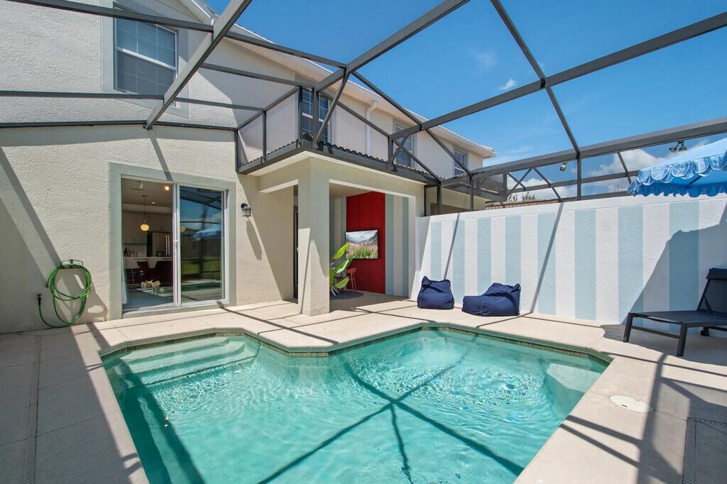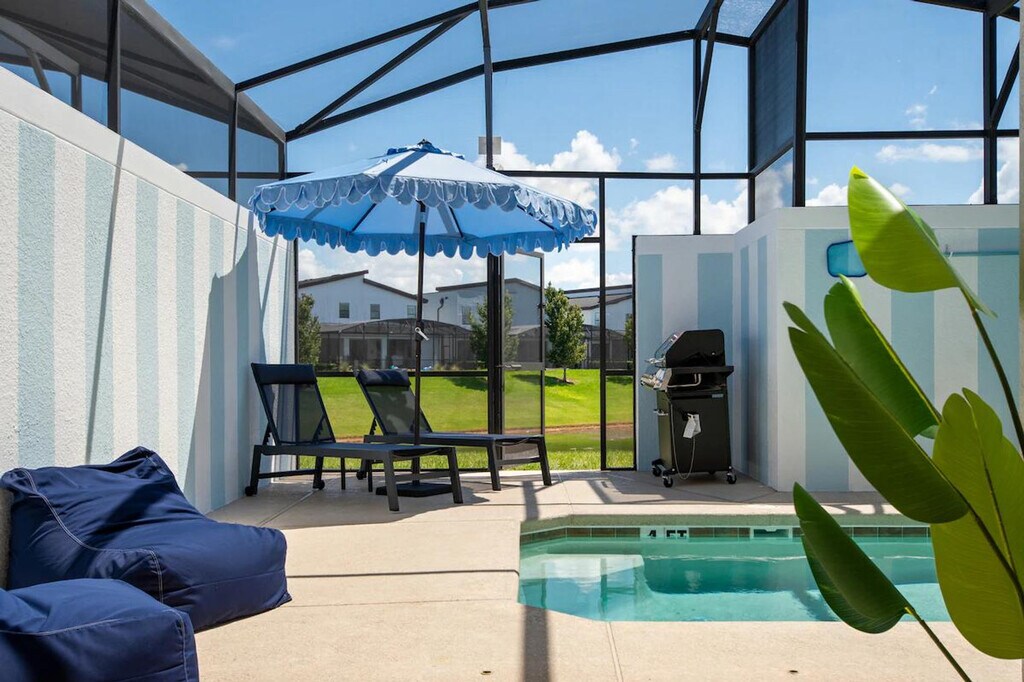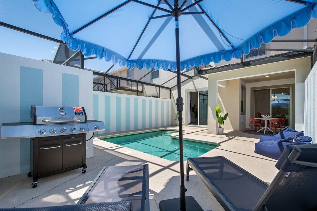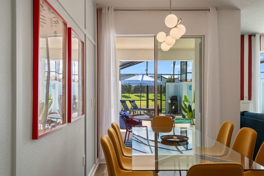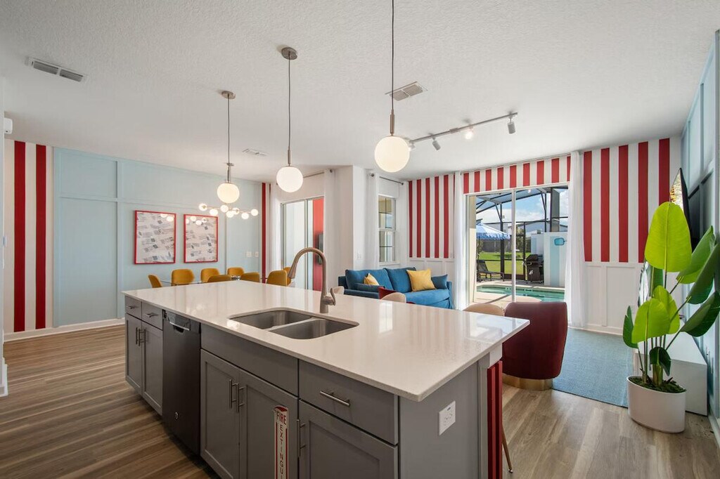 Feel at home in this freshly remodeled 4-bedroom home in Orlando, just 6 miles from Disney. This home sleeps 12 and features 3 baths. This family-ready home includes a high chair, stroller, Pack ’n Play, and is pet-friendly. Enjoy access to Storey Lake’s water park, lazy river, tiki bar, and mini golf. The dining area offers seating for 8 plus 4 bar stools, along with a 65" Smart TV. The fully equipped kitchen features modern appliances, cookware, utensils, a coffee maker, and a toaster. The bedrooms offer comfort and style, with a king-size bed in two bedrooms and full-over-full bunk beds in the other two. Enjoy the private screened pool with an outdoor TV and dining area. Optional pool heating is available for $35 per day. Up to 2 dogs are welcome for a $150 pet fee. Perfectly located, this home is 7 miles from Disney, 11 miles from SeaWorld, 17 miles from Universal, and 20 miles from MCO. Enjoy pool and lake views from the dining and living area. Guests are responsible for refilling the barbecue propane tank. Please keep pets leashed outside, never leave them unattended unless crated, and clean up after them. This home is located in a gated community. [SI]