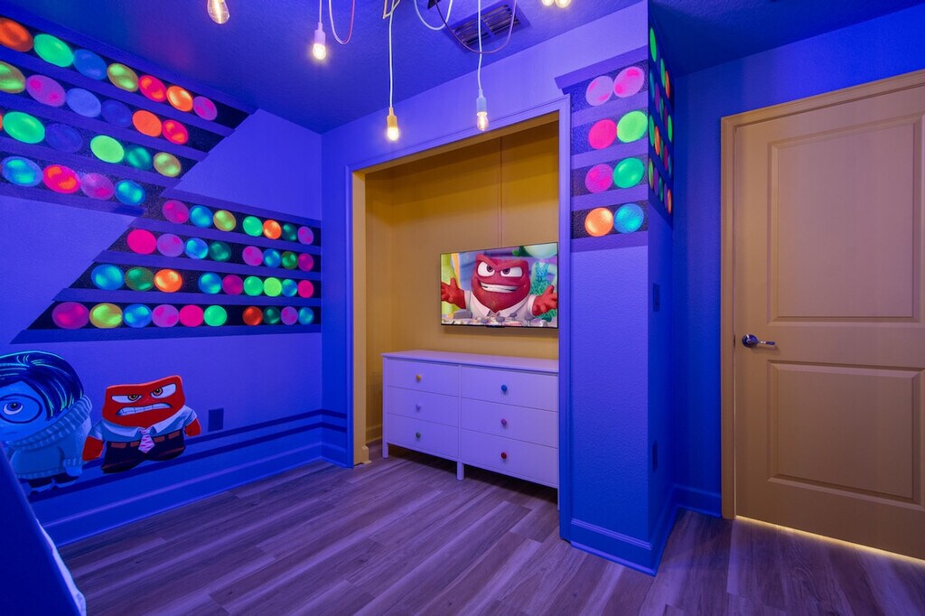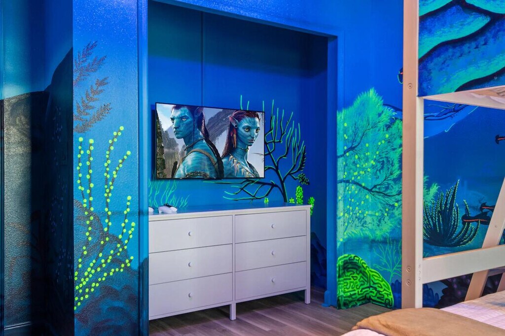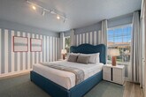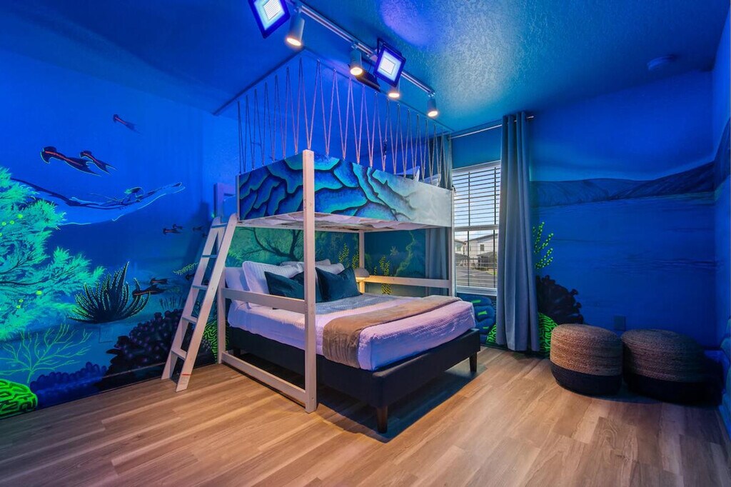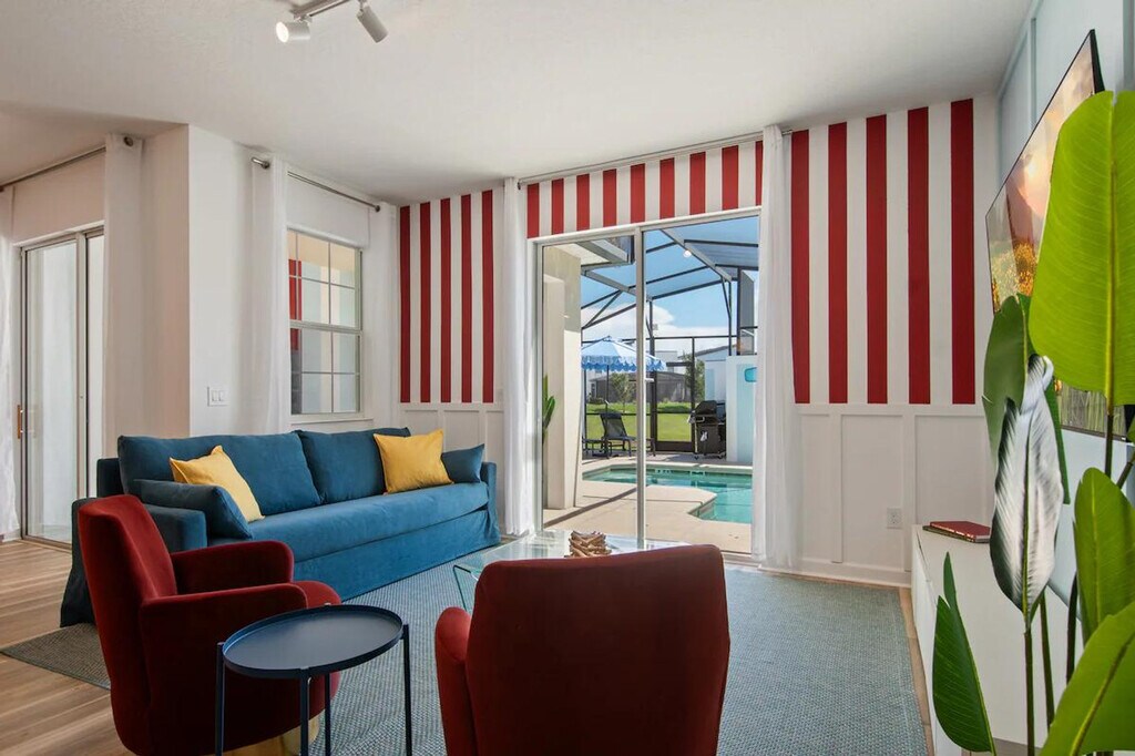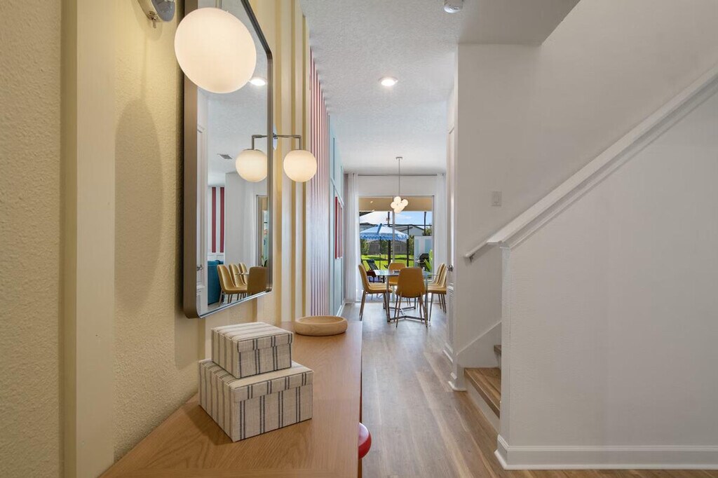 Feel at home in this freshly remodeled 4-bedroom home in Orlando, just 6 miles from Disney. This home sleeps 12 and features 3 baths. This family-ready home includes a high chair, stroller, Pack ’n Play, and is pet-friendly. Enjoy access to Storey Lake’s water park, lazy river, tiki bar, and mini golf. The dining area offers seating for 8 plus 4 bar stools, along with a 65" Smart TV. The fully equipped kitchen features modern appliances, cookware, utensils, a coffee maker, and a toaster. The bedrooms offer comfort and style, with a king-size bed in two bedrooms and full-over-full bunk beds in the other two. Enjoy the private screened pool with an outdoor TV and dining area. Optional pool heating is available for $35 per day. Up to 2 dogs are welcome for a $150 pet fee. Perfectly located, this home is 7 miles from Disney, 11 miles from SeaWorld, 17 miles from Universal, and 20 miles from MCO. Enjoy pool and lake views from the dining and living area. Guests are responsible for refilling the barbecue propane tank. Please keep pets leashed outside, never leave them unattended unless crated, and clean up after them. This home is located in a gated community. [SI]