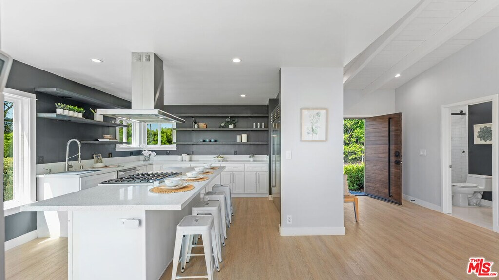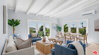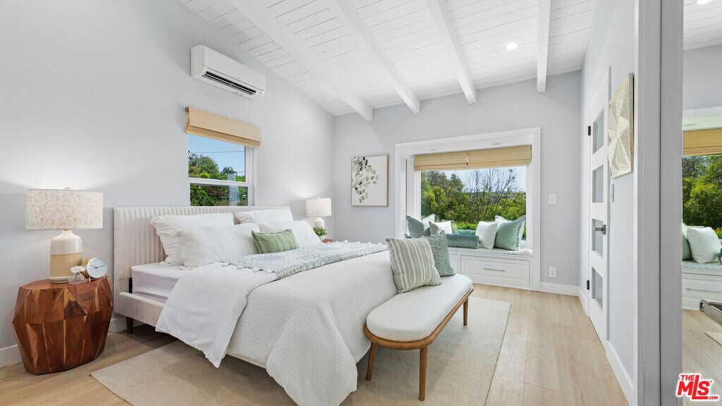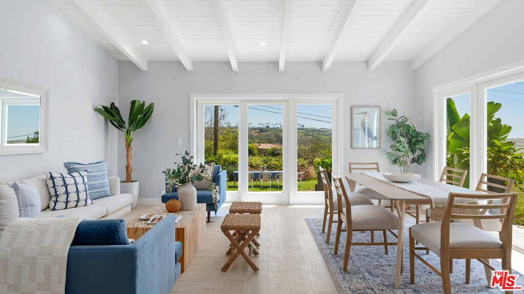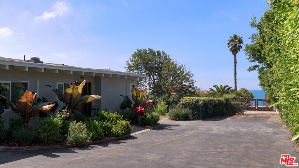 Nestled in a prestigious community in western Malibu with close proximity to the high school, this luxury residence invites you in with its meticulously landscaped and gated yard on approximately 0.8 acres. Enter into a stunning foyer, where wood-beamed ceilings and rich vinyl floors set a warm and welcoming tone. Bathed in natural light, the home offers an ideal blend of classic charm and modern convenience.The living room, adorned with wood-beamed ceilings and sleek vinyl floors, features sliding glass doors that open to the expansive backyard, making it a perfect space for indoor-outdoor living. Just off the living room, the kitchen is a culinary dream, featuring quartzite countertops, a large stone island with a hood fan above a five-burner range, and top-of-the-line Viking and Bosch appliances. The kitchen offers breathtaking ocean and Point Dume views, creating a serene backdrop for cooking and entertaining.The primary suite offers a peaceful retreat with ocean views, a cozy reading nook, and a walk-in closet. Its high, wood-beamed ceilings and bay window enhance the room's airy, tranquil atmosphere. Outside, the sprawling backyard offers lush grass lawns and views of both the ocean and surrounding mountains. With ample parking, this home combines luxury, comfort, and natural beauty in one exquisite package. MLS# 25616667
