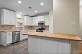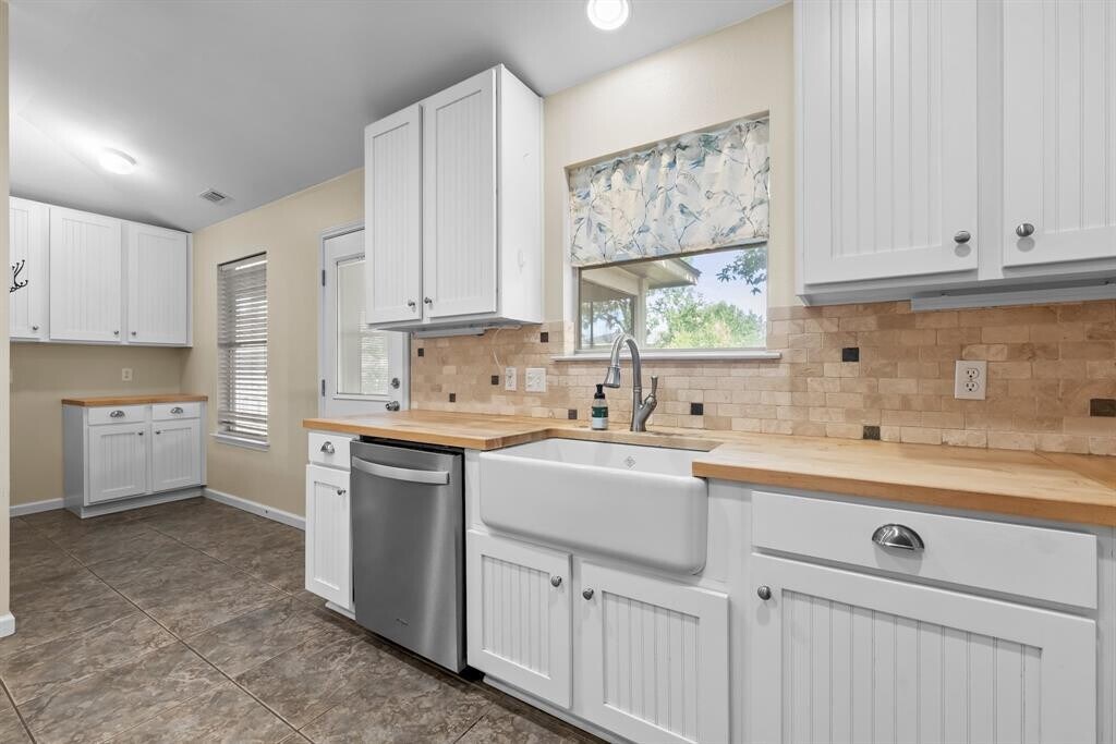 This charming home has a lovely covered front porch that welcomes you to this one-story 3 bedroom, 2 bath home with large flexroom off living room perfect for an office or playroom/game room, or 4th bedroom. The home features several large shade trees on the oversized corner lot. Solid surface flooring throughout with spacious living and dining areas and high ceilings. Updated bathrooms with walk-in showers. Kitchen has tile backsplash, stainless-steel appliances, farm-style sink and classic butcher-block counters, also a mudroom or butler's pantry area off kitchen. Backyard features a covered patio, large shade trees, shed with electricity, and 2-car detached garage. Enjoy all the amenities that Plum Creek has to offer: tree-lined streets, community parks and swimming pools, pickle ball, hike/bike trails, and nearby Plum Creek golf course. Convenient proximity to restaurants, shopping, schools, and downtown Kyle.
