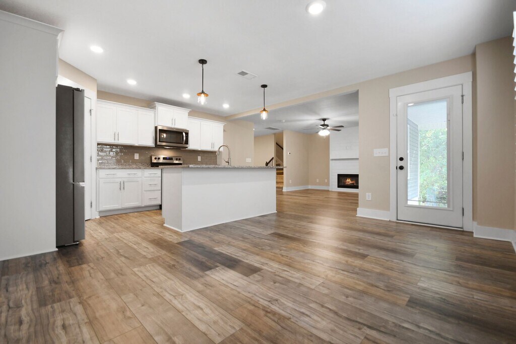 Beautiful four bedroom, two and a half bath home featuring laminate flooring throughout the main living areas! The spacious living room offers a cozy shiplap fireplace, while the eat in kitchen is equipped with granite countertops, stainless steel appliances, and a large island! The primary suite includes a full bath with double vanity, soaking tub, and a tiled shower! All guest rooms are generously sized! Enjoy the outdoors with a covered patio and the added privacy of no backyard neighbors! Pet Rent Scale - Dogs: $25.00 per month - Cats: $35.00 per month