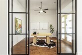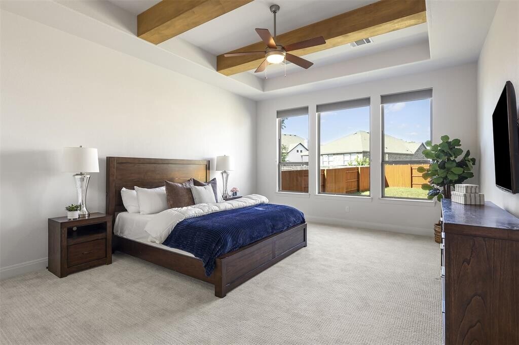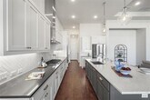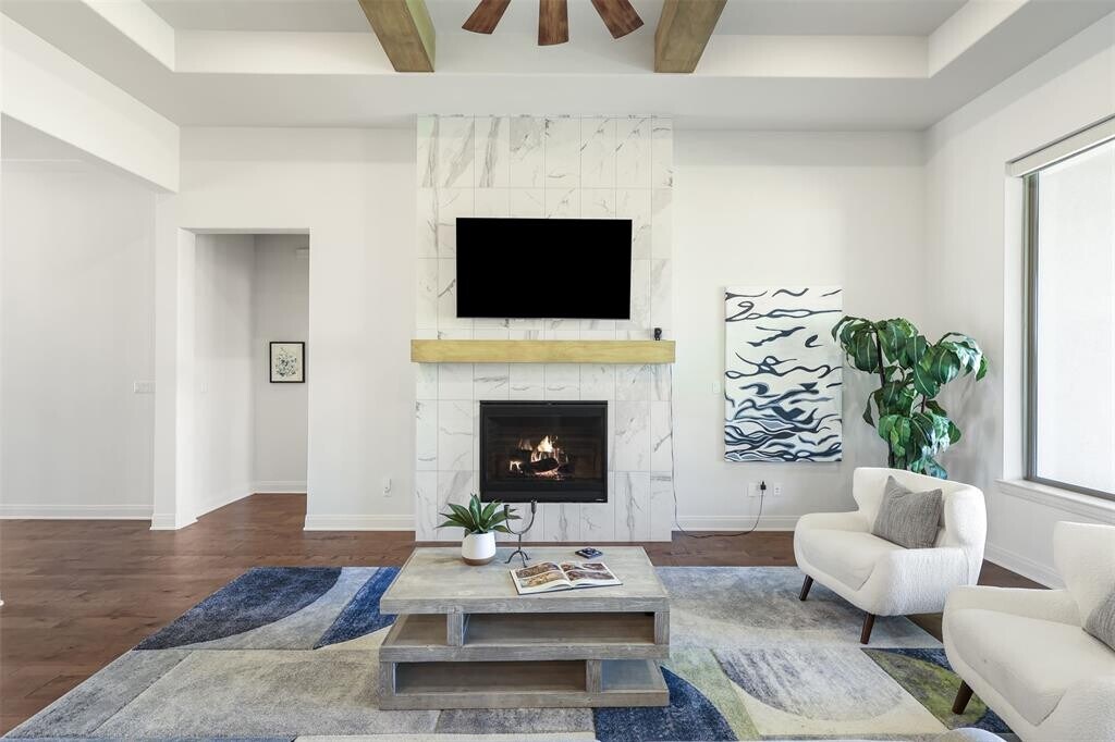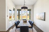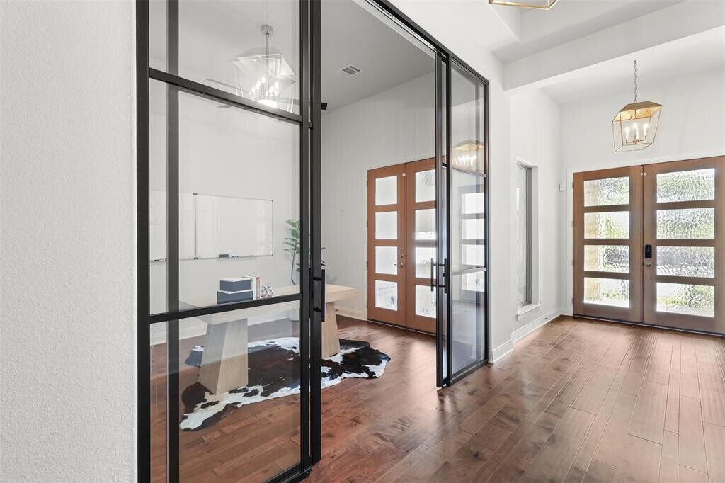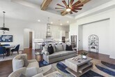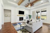Welcome to 299 Peakside Circle, a stunning single-story, 4-bedroom, 4.5-bathroom home in the highly desirable Caliterra community of Dripping Springs, TX. Built by the esteemed Drees Custom Homes, this one-of-a-kind 3,538 sq. ft. residence sits on a spacious 0.34-acre lot on a quiet street, offering both luxury and tranquility. Designed with a thoughtfully planned layout, each bedroom features its own ensuite bathroom for ultimate privacy. The open floor plan showcases vaulted ceilings and an array of high-end upgrades. A private office with an exterior balcony and sliding glass doors provides the perfect workspace, while automated blinds frame views of the expansive backyard. The warmth of hardwood floors flows through all common areas, complemented by plush new carpet in the bedrooms. Custom wood beams add striking architectural detail to both the family room and the primary suite, enhancing the home’s inviting character. A dedicated entertainment/media room offers an ideal setting for movie nights, while the spacious covered back patio is perfect for outdoor entertaining. The gourmet kitchen is a chef’s dream, featuring stainless steel appliances, a butler’s pantry, a double oven, and an oversized walk-in pantry. Ceiling fans throughout the home, including a dramatic oversized fan in the family room, ensure comfort year-round. The large primary suite is a true retreat, boasting a huge walk-in closet and spa-like ambiance. Storage is abundant throughout the home including a 3-car garage. Lightly used as a vacation home, this meticulously maintained property is truly move-in ready. Situated in the heart of Dripping Springs, this exceptional home offers easy access to Austin, the Texas Hill Country, top-rated DSISD schools, and renowned local wineries and breweries. The heart wants what the heart wants!