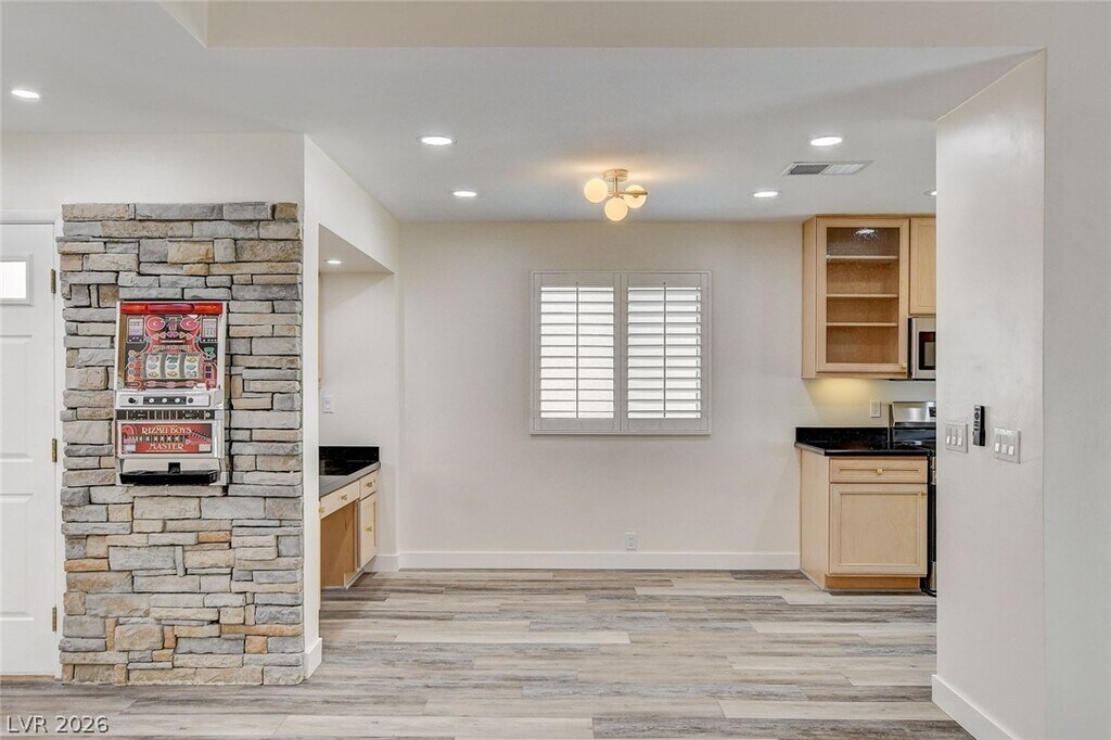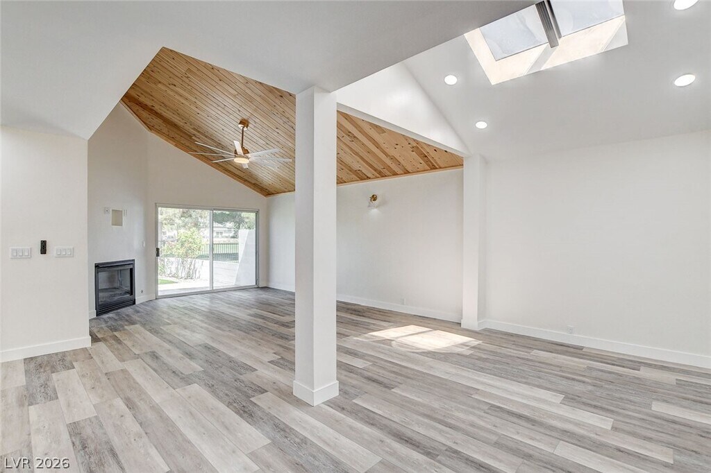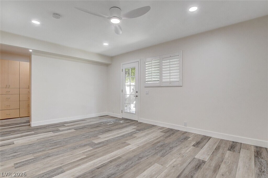Rare Single-Story Golf Course Home for Rent in Guard-Gated Las Vegas Country Club Located on prestigious Bel Air Drive, this detached 1-story home backs directly onto the lush Las Vegas Country Club PGA golf course with a private gate to the 8th fairway. Features include vaulted ceilings with skylights, a spacious primary suite with walk-in closet and spa-style bath, and a second bedroom ideal for guests or a home office with its own bathroom. The bright kitchen overlooks the golf course and offers Strip views. Private central courtyard with mature fig tree. Two-car garage (one bay with A/C). Prime central location just minutes to the Las Vegas Strip, airport, UNLV, and Allegiant Stadium. Community pool only 100 yards away.