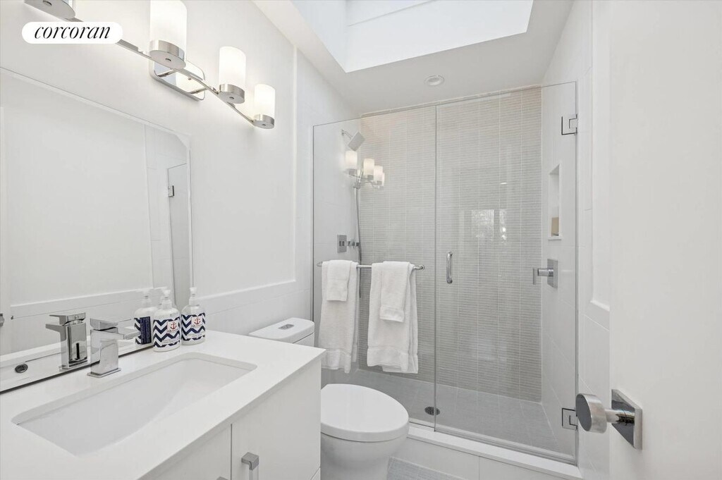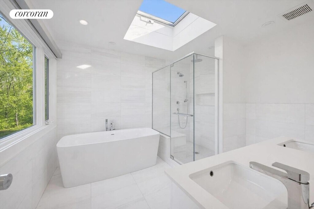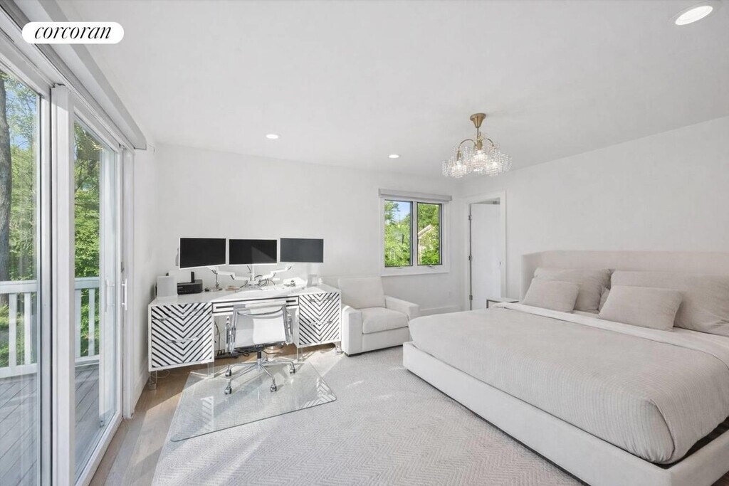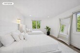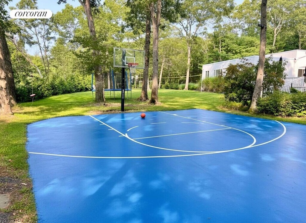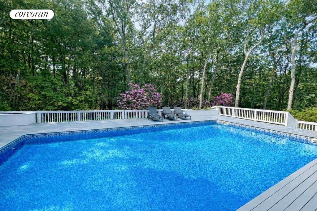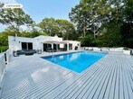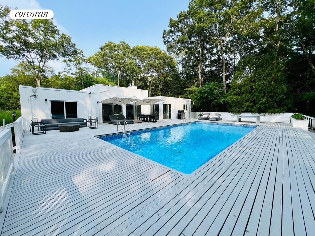 Set just shy of an acre at the end of a quiet Quogue cul-de-sac, this bright, fully renovated four-bedroom, three-bath home offers effortless Hamptons living. A dramatic great room with 12-foot ceilings, skylights, and floor-to-ceiling windows fills the space with natural light and opens to an expansive deck and 20'x40' heated pool. The sleek kitchen features custom cabinetry, quartzite counters, and Thermador, Viking, and Bosch appliances, plus counter seating and a glass dining area. The airy interiors include grey oak floors, Restoration Hardware furnishings, and a cozy wood-burning fireplace. Outdoor amenities abound - multiple dining and lounge spaces, a fire pit patio, outdoor table tennis, and a half basketball court. The primary suite offers a king bed, spa bath, and deck access; three guest bedrooms (one of them en-suite) complete the layout. Just two miles to Quogue Village Beach and close to the Quogue Wildlife Refuge, this is the ideal summer rental.