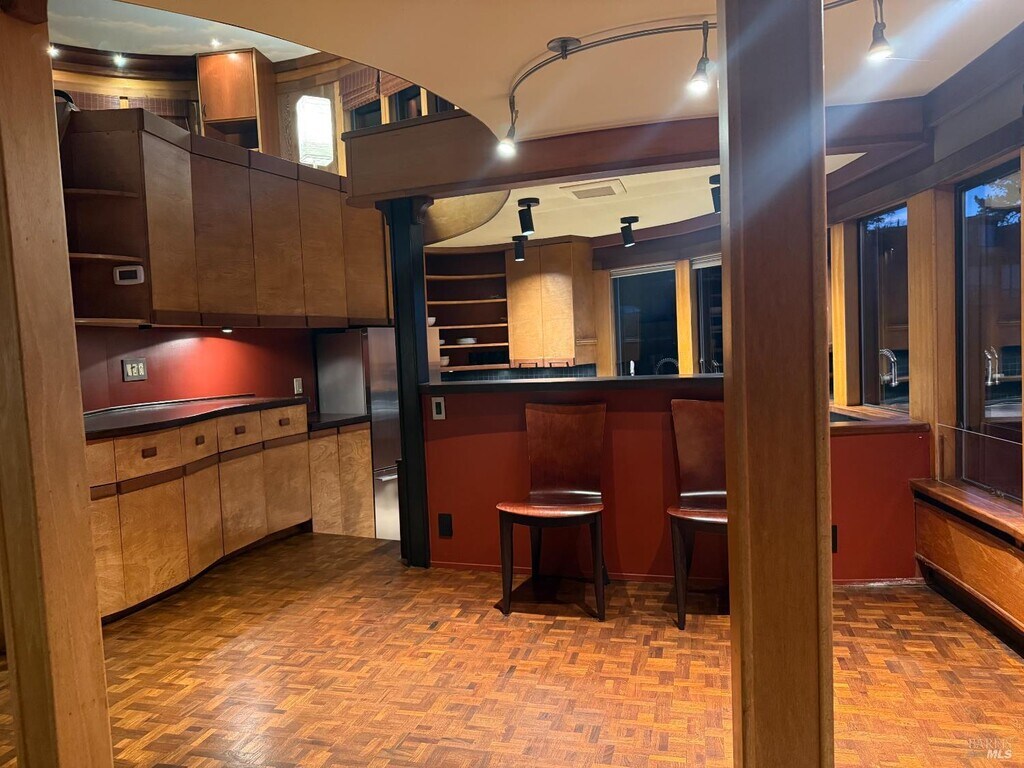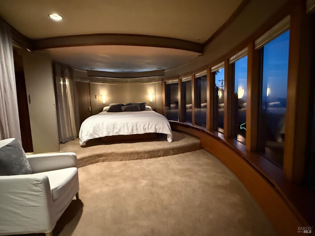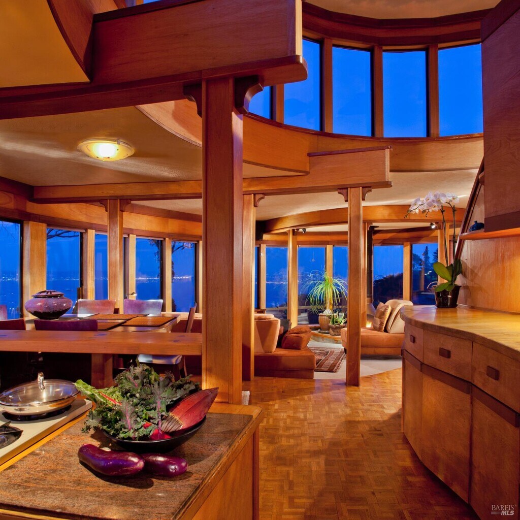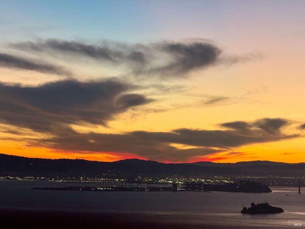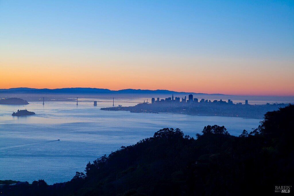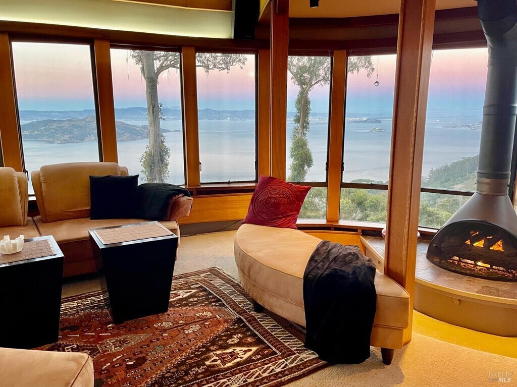 On a private ridge above Sausalito's waterfront, adjacent to the GGNRA National Park, this bespoke home features curvaceous, biophilic design and walls of glass framing spectacular Bay views with sunrise and moonrise from every main room. A few steps from parking to the gated deck and entry into the open great room with sunken Malm-fireplace seating facing the City skyline, dining area showcasing Angel Island, and kitchen overlooking Richardson Bay. Gently curved staircases connect all levels. The loft office has built-ins and million-dollar outlooks. Two bedrooms with en-suite baths are set on separate levels for privacy, including a primary with dual shower and generous closets, plus a flexible small room for a home gym, art studio, or second office. A rare opportunity to live in a home where architecture and nature converge, with 140 miles of Marin Headlands trails just 0.25 mile away, yet only 4.2 miles to San Francisco. A serene base to enjoy the unparalleled food, art, and natural beauty of the Bay Area. 2 miles to downtown Sausalito & the ferry, 1 mile to Marin Airporter & GG transit. Partially furnished. Private road, no drive-bys please. MLS#325086335
