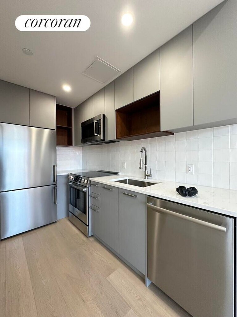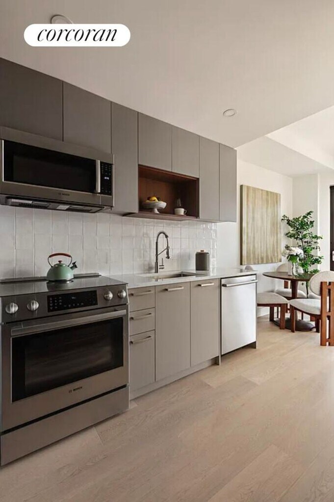 First Occupancy One-Bed with Balcony Be the first to call this brand-new home yours at 30 Bushwick Avenue, a newly constructed luxury condominium in the heart of Williamsburg. Residence 4A is a pristine one-bedroom, one-bathroom apartment offering an open, airy layout designed for modern living.Wide-plank white oak engineered floors flow throughout the residence, leading to a private balcony that extends the living space outdoors. The home features individual heating and cooling with central air in both the living room and bedroom, along with an in-unit washer/dryer for ultimate convenience.The bedroom is bright and spacious, featuring oversized windows, generous closet space, and its own independently controlled climate system for year-round comfort.The kitchen is fully new and thoughtfully designed with crisp white countertops, custom shaker-style cabinetry, open shelving, and premium Bosch appliances, complemented by a sleek Bertazzoni refrigerator-a perfect blend of performance and modern aesthetics.The bathroom showcases a refined, contemporary design with a wood vanity, black Moen fixtures, and an illuminated mirror.Residents enjoy a curated amenity package, including a fitness room, stylish lobby, and a rooftop deck with panoramic skyline views.Situated in one of Brooklyn's most vibrant neighborhoods, 30 Bushwick Avenue is moments from top-rated restaurants, cafés, boutiques, and cultural destinations. McCarren Park is nearby, and easy access to the L and G subway lines makes commuting effortless.-Fee Disclosure: Application Fee (Non-refundable): $20 Processing Fee (Non-refundable): $595 (includes one background screening) Additional Background Screening Fee (Non-refundable): $75 per additional applicant Move-in Deposit (Refundable): $1,000 Move-out Deposit (Refundable): $1,000
