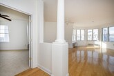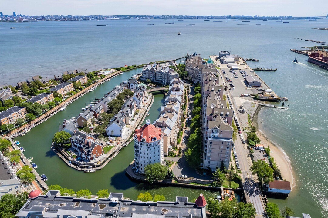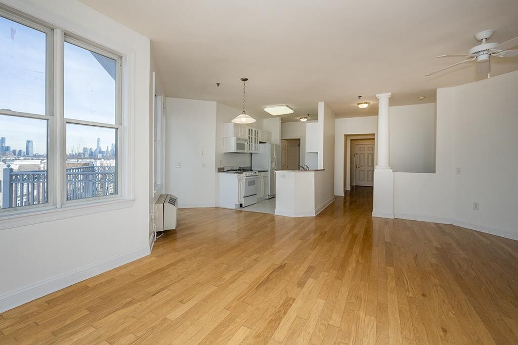 FOR RENT - PORT LIBERTE - More photos and floorplans coming - Corner condo with over 1200 sf. Wonderful sunlight in living and dining area with many windows in the turret. Access to private balcony just off kitchen. Galley style kitchen and great open floorplan. As you enter, there is a mud room with coat closet and full size washer/dryer. The living room columns add a touch of charecter to the space. Bedrooms are on opposite sides of the home. Primary bedroom offers large walk-in closet. En suite bath with terrazzo marble, soaking tub and separate shower. Guest bath with shower and tub. Rent includes: hot/cold water, garage parking and the use of all of Port Liberte's luxurious amenities. They include: 24 hour gated security, landscaped areas and park, professional gym, tennis/basketball courts, tot lot and two resort style pools. Easy commute with on-site ferry to Downtown NYC and shuttle bus to the Grove St. Path. Availalbe: May 15th