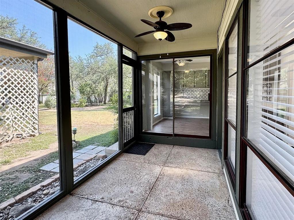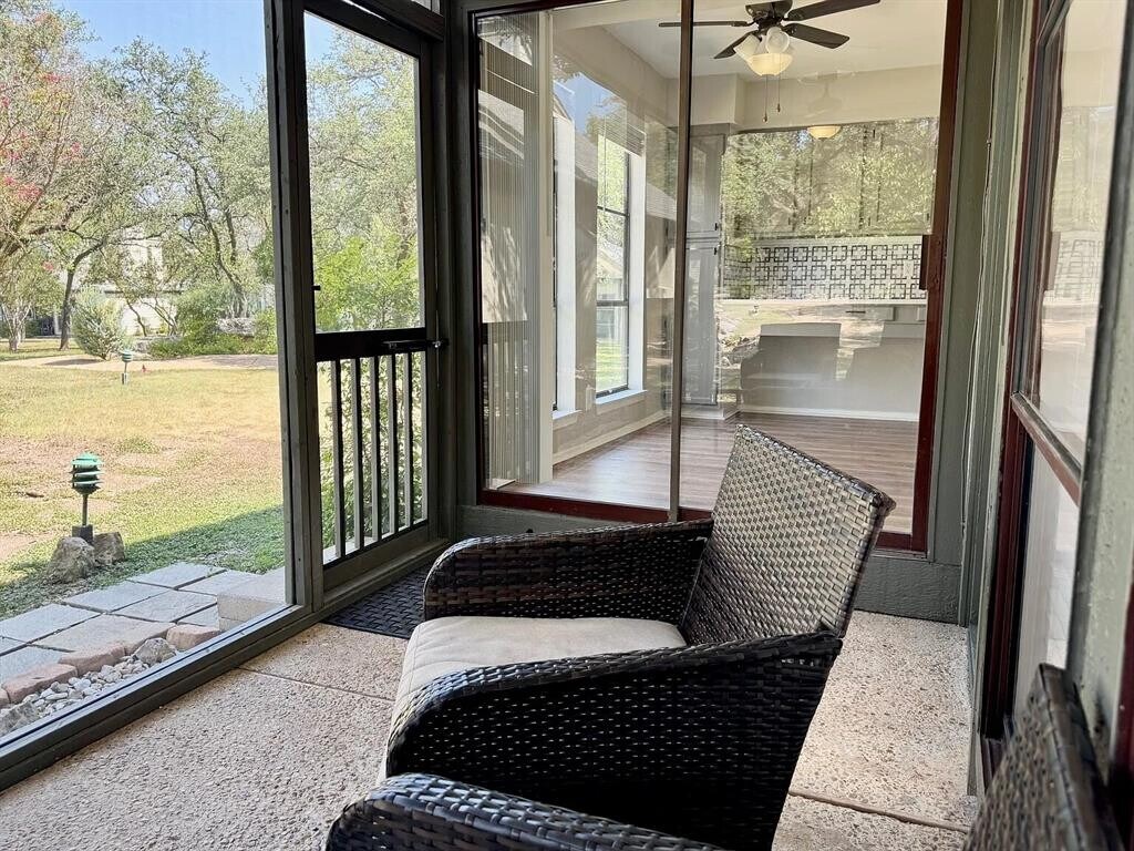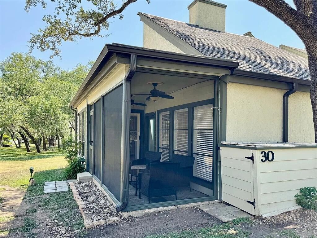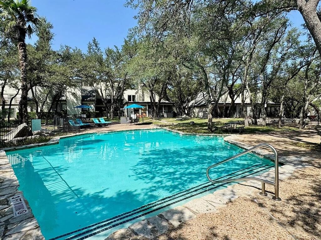 This beautifully newly remodeled, single-story condo in the heart of Lakeway offers a peaceful and inviting retreat. Featuring 3 bedrooms and 2 full bathrooms, this home is perfect for those seeking comfort and serenity. Just outside, you'll find a lovely pool surrounded by majestic oak trees, providing a picturesque setting for relaxation. Inside, the condo boasts an open and airy living space with soaring ceilings and floor-to-ceiling windows that flood the home with natural light. The central focus of the living room is a cozy wood-burning fireplace, perfect for creating warmth and ambiance. A wet bar adds a touch of elegance, making it ideal for entertaining guests. The formal dining room, adorned with beautiful skylights, leads to a well-equipped kitchen featuring gleaming hardwood vinyl plank flooring and a breakfast room that opens to an outdoor covered patio. This screened-in patio, accessible from both the kitchen and living room, offers a peaceful spot to unwind and enjoy the sounds of nature. The primary suite is generously sized, with two walk-in closets and a full en-suite bathroom. Two additional bedrooms and a charming full bathroom with a shower/tub combination complete the living space. Fresh paint throughout adds a modern touch to this warm and inviting home. Lakeway offers access to Lake Travis, hiking and biking trails at Hamilton Greenbelt, and the nearby Lakeway City Park, which features a dog park, playgrounds, hiking/biking/ jogging trails, and water activities. Short distance to plentiful shops and restaurants in Lakeway and Hill Country Galleria. Located within the highly esteemed LTISD.