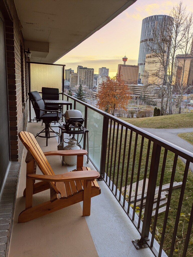 The fully furnished executive suite walking to downtown The fully furnished executive suite is located in the Holly Park apartments across the river from downtown Calgary. Here are the suite's key features and benefits: - within walking distance to downtown Calgary;a - this non-smoking suite has been professionally cleaned from top to bottom; - all of the furnishings, small appliances, media, housewares, bed and bath linens, are brand new quality items selected by a designer specifically for this suite's executive lifestyle; - Fabulous view of downtown Calgary. - secure indoor parking parking; - pool, Jacuzzi, weight room, squash court; - quiet adult complex in an established neighbourhood Apartment Details Entry -the large entry, in addition to a closet, has extra storage both in the storage bench and full sized chest of drawers. Kitchen & Dining - the huge kitchen, along with the cook top, oven, microwave, side by side refrigerator and dishwasher is outfitted with a Keurig coffee maker and toaster; - also included but not shown are quality pots and pans, Cuisinart blender and hand mixer, cooking and food preparation utensils, plate and beverage service for 8-12, cutlery service for 12, dish rack and starter cleaning supplies; - with a great view to downtown, the counter height round table seats 4-6 in roomy chairs. Living Room - a man-sized custom-made in Canada sofa with chaise, as well as a 52 inch television, stereo and surround sound make this the perfect room for relaxation; - remove the back cushions from the sofa and use the extra bedding stowed in the storage ottoman for the impromptu overnight guest; - an ample desk with side extensions has access to the internet. Bedroom - a high quality queen sized mattress (brand new along with everything else) is outfitted with high thread count cotton linens; - other features include a a suit valet and pant press, a large deep closet (inside closet not shown) with a tall chest of drawers, suit hangers and extra bedding. Bathroom - new fixtures, ample under-counter storage, plentiful new towels, blow dryer. Laundry Room - the spacious laundry room also has additional bank of built in shelves for additional storage (not shown; - spotless washer and dryer, iron and ironing board Outdoor Deck - barbecue and deck furnishings for dining al fresco and enjoying the stunning views to the Holly Park gardens as well as downtown. 300 Meredith Rd NE, Calgary, AB T2E 7A8 $1800/month + DD, 6 month minimum term