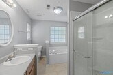 CORNER LOT SIDE ENTRY GARAGE IN HIGHLY DESIRABLE CREEKWOOD NEIGHBORHOOD. FRESHLY PAINTED & NEW LVP,NO CARPET LOCATED WITHIN MINUTES OF REDSTONE ARSENAL GATE 9,BRIDGE STREET,MID CITY & RESEARCH PARK. POPULAR OPEN FLOOR PLAN HAS SOAING CEILINGS IN THE GREAT ROOM W/ NEW FIREPLACE TILE. MASTER SUITE ON MAIN LEVEL PLUS POWDER ROOM OFF FAMILY ROOM. KITCHEN HAS NEW TILE BACK SPLASH,FRESHLY PAINTED CABINETS,STAINLESS APPLIANCES. 2 ADDITIONAL BEDROOMS UPSTAIRS PLUS REC RM/LOFT AREA UPSTAIRS & FULL BATH. NEIGHBORHOOD CONNECTS TO PLAYGROUND,3 MILE NATURE TRAIL,DOG PARK & COVERED PAVILIONS. HUGE BACKYARD HAS MATURE TREES WITH PRIVACY FENCE.