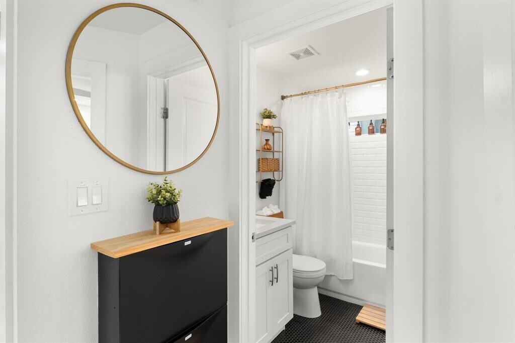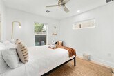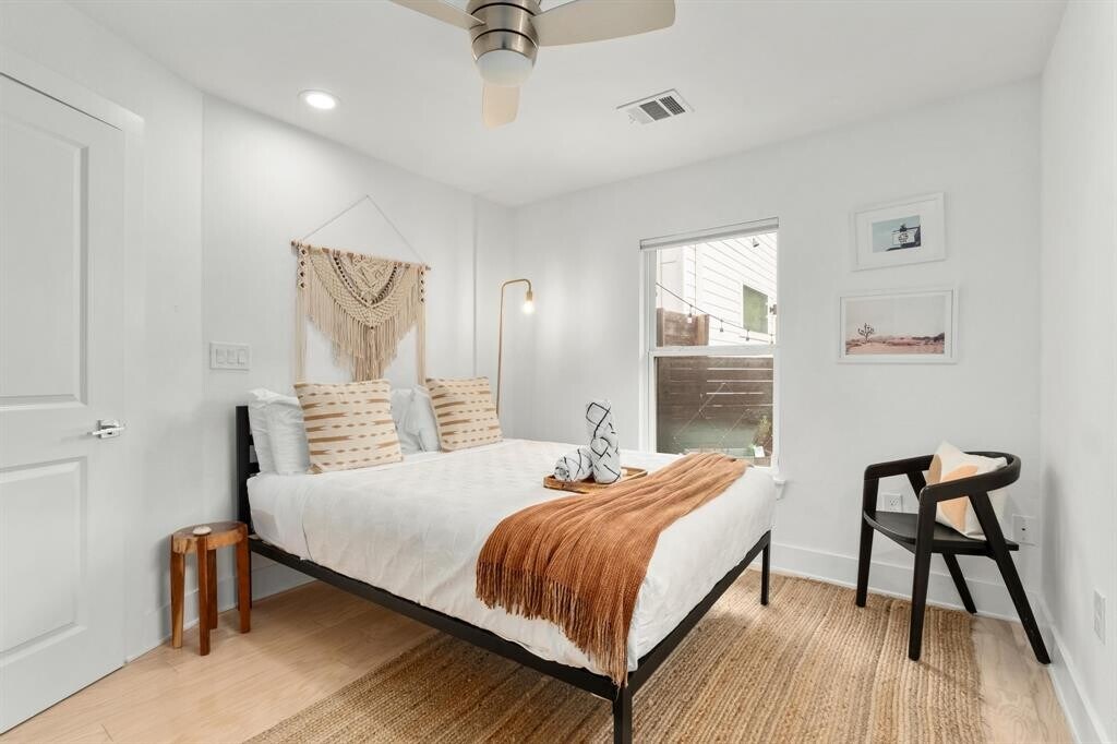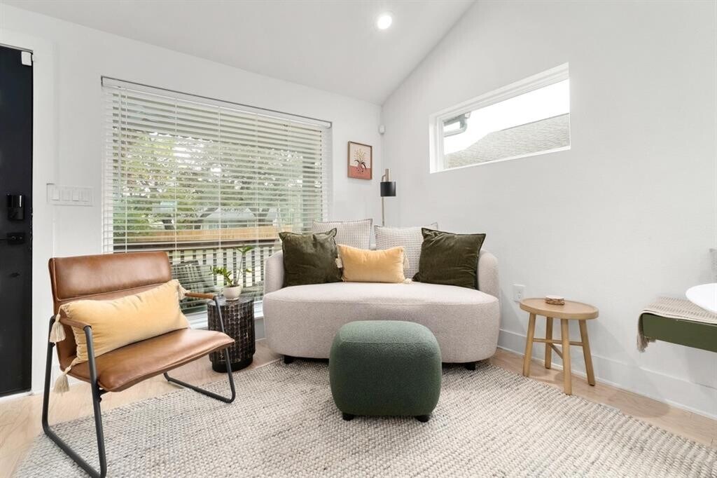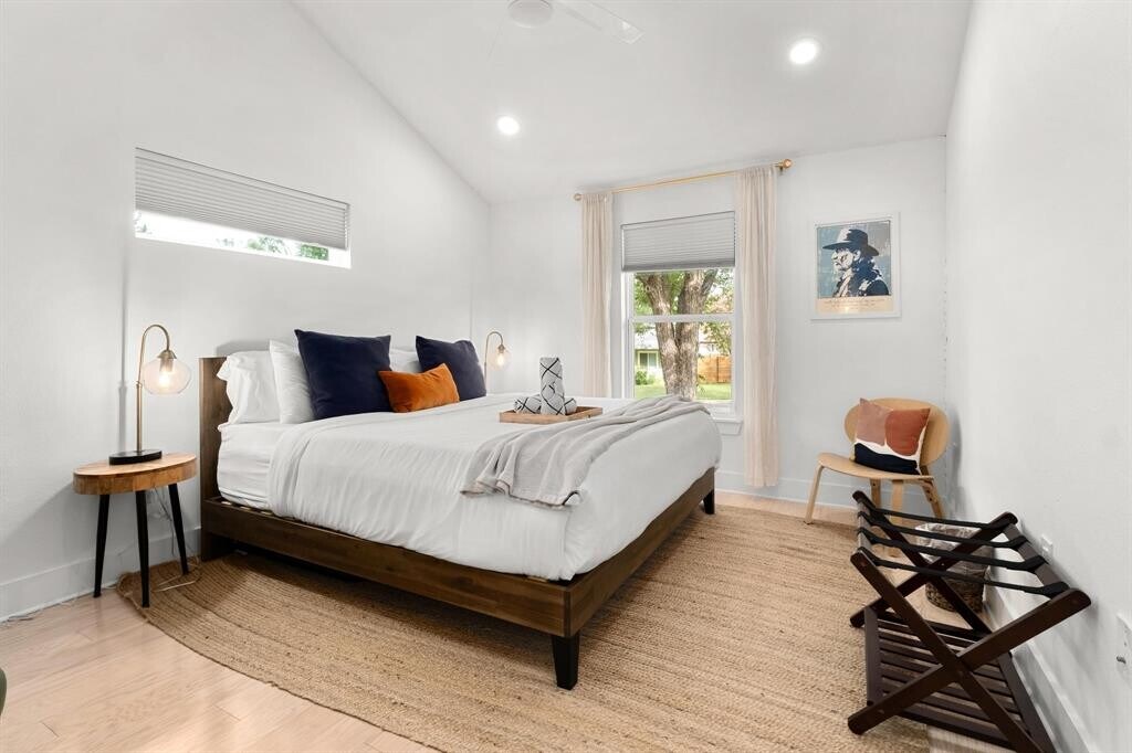 Tucked into a quiet pocket of East Austin, this fully furnished 2-bedroom, 1-bath modern cottage offers comfortable, easy living. Built in 2018 and well maintained, the home features an open floor plan with high ceilings, wide-plank flooring, and abundant natural light. The kitchen includes quartz countertops, stainless steel appliances, gas range, and custom tile backsplash, and opens to the living and dining areas. A dedicated workspace and high-speed WiFi provide added functionality. The primary bedroom features a king bed, while the secondary bedroom includes a queen bed. The bathroom offers a tub/shower combination with updated fixtures. Exterior features include a fully fenced backyard with turf and gravel patio, string lighting, and a covered front porch with hammock swing. Additional features include in-unit washer and dryer, Smart TV, keypad entry, and a fully stocked interior with linens and kitchenware. Ample street parking. Single-level layout. Convenient East Austin location with easy access to UT, Downtown, Mueller, and the airport, as well as nearby restaurants, coffee shops, and trails. MLS ID 1133183