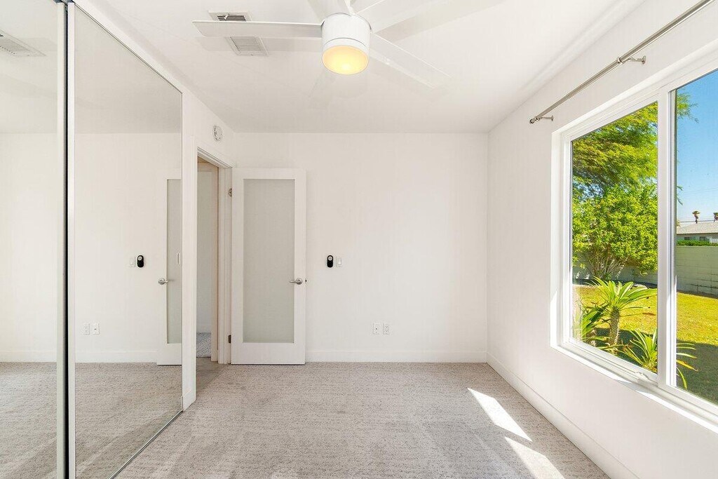 Need a soft landing before you buy or the perfect work-from-home space? This beautifully remodeled 3-bedroom,2-bath home in Palm Springs is available for a 12-month lease and offers comfort,privacy,and incredible mountain views. Enjoy a spacious,private backyard with a covered patio,built-in BBQ,and a Pebble Tec saltwater pool and spa perfect for relaxing or entertaining. Inside,the home features a bright,open feel with large windows,a modern kitchen with stainless steel appliances and quartz countertops,and clean,updated finishes throughout. Additional perks include a finished 2-car garage,RV parking,solar for energy efficiency,and included refrigerator,washer,and dryer. Pet-friendly with approval. Move-in ready come experience the Palm Springs lifestyle! Home has solar. Great utility savings. Bathroom in garage to service pool. MLS # 219146841