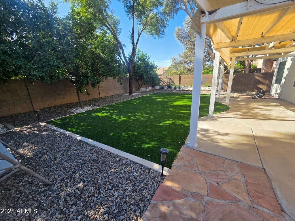 Beautiful home shows pride of ownership and No HOA! Spacious great room plan with formal dining and breakfast nook includes breakfast bar and bay window with view of front yard from kitchen. Master is split on the floor plan and includes large walk-in closet,separate tub/shower and dual vanity. This home boasts many upgrades including wood tile and wood floors,security screen door,vaulted ceilings,outdoor pergola to extend covered patio,built-in garage cabinets and laundry sink,exterior garage access panel. Three citrus trees and mature shade trees grace the grassy backyard. Convenient north Phoenix location with easy access to Hwy 51 & loop 101,nearby community park & Costco.