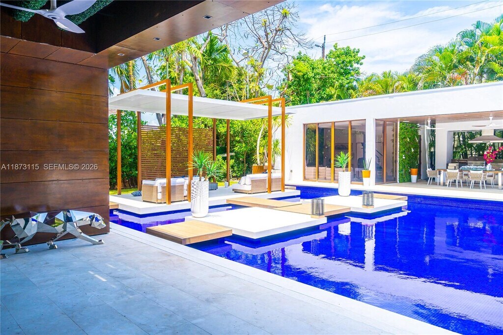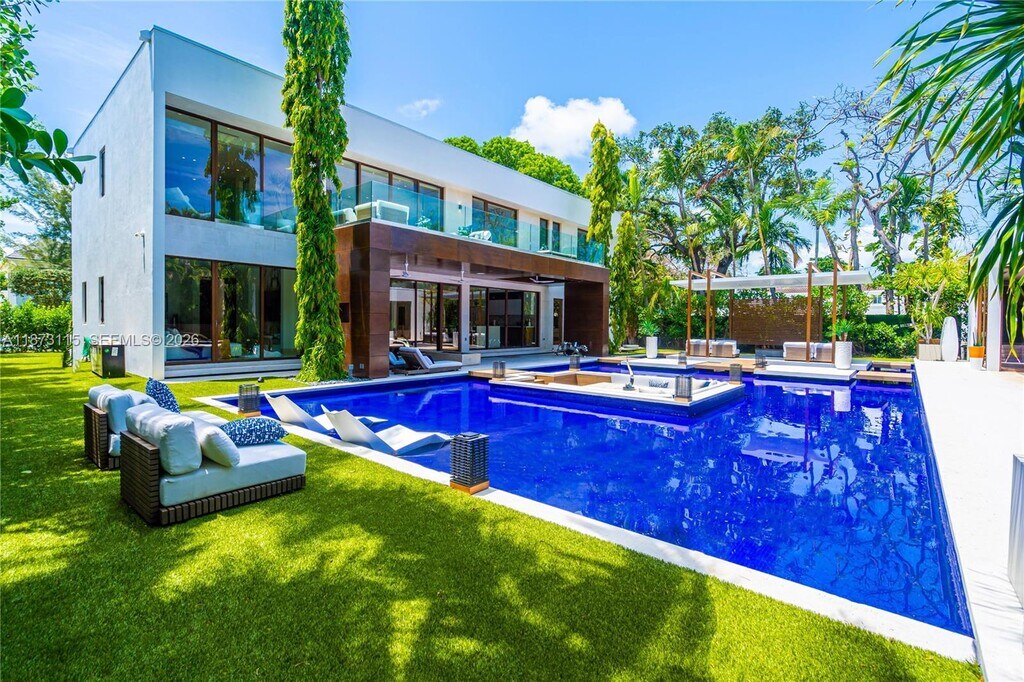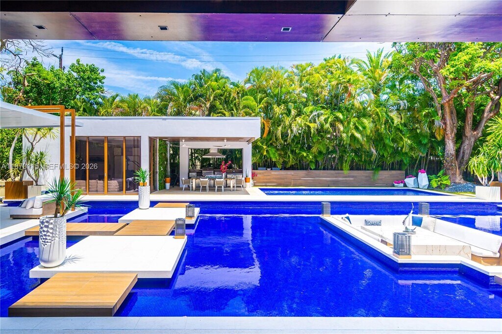 Exquisite modern residence is a stunning expression of contemporary luxury in one of Miami Beach's most exclusive neighborhoods. Spanning 5,119 SF + 14,300 SF lot, home features 4 beds/4.5 baths & open, light-filled design w/ bespoke detail throughout. Great room is framed by floor-to-ceiling glass, seamlessly connecting to lush landscaping by Lewis Aqui. Marble & quartz flooring on the 1st level transition to warm oak upstairs, complemented by elegant Delta lighting. Snaidero kitchen w/ Miele appliances, double ovens + sleek cabinetry. Spaces include office, den, pool house + gym. Outdoors, shimmering pool, summer kitchen & dining areas provide the perfect setting for entertaining. The home's refined aesthetic is enhanced by Prodema cladding, while a full-house generator adds convenience. MLS # A11873115