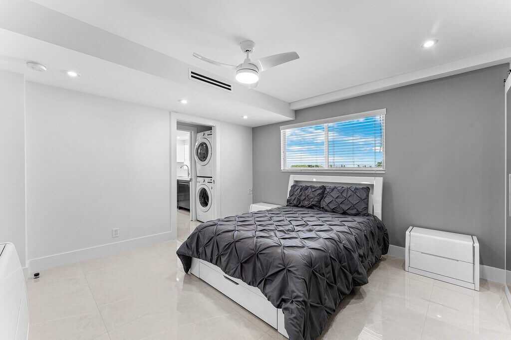 Location, Views, and Brand NEW! Completely renovated with high end, luxurious finishes. This open concept 2 bed/2 bath condo offers large tile floors throughout; quartz countertops, backsplash, and waterfall edges; LG stainless appliances; impact windows; new A/C and water heater; rain and handheld shower heads; free standing tub; square tiled shower drains; linear vent covers; custom built-in closets; raised kitchen/floating ceiling; LED lights throughout; sensor lights in bathroom, closets, and cabinets; and automatic blinds. The SE/SW exposure fills the space with natural light. Reclining sectional is comfortable spot to watch TV or enjoy the views. Private entrance to unit and easy access to covered parking spot. Close to PBI airport & world-class shopping, dining, diving, and fishing