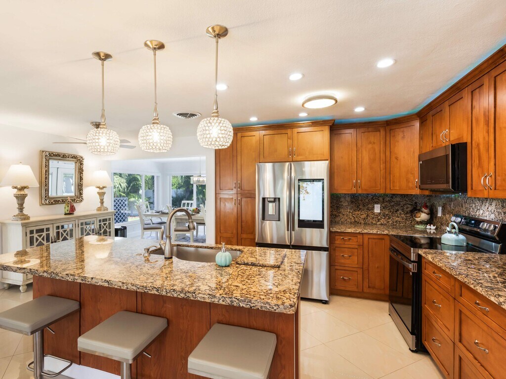 Updated Boca East home with 3 beds, (3rd B/R convertible Den) & 2 full baths, heated saltwater pool, and fenced backyard. Open-concept kitchen and living/dining with new stainless steel Wi-Fi appliances, Italian tile, and Travertine pool deck. Side parking for boat/RV with EV charger and carport. No HOA. A-rated schools. A few minutes from the beach. Available furnished or unfurnished. Upgrades: Impact Windows; AC 2020, roof 2013, 2019, pool heater 2023.