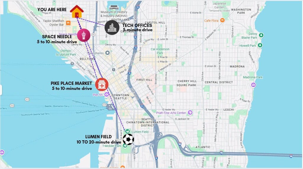 Experience the perfect balance of city convenience and comfort at this stylish retreat in Queen Anne! Nestled in one of Seattle’s most sought-after neighborhoods, this corner unit offers unmatched finishes, combining modern luxury and city convenience. Feel at home in this cozy escape, ideal for extended stays. This exceptionally designed corner unit offers a blend of comfort, luxury, and style, featuring floor-to-ceiling windows that fill the space with natural light. The entry level boasts a designer kitchen and an open living area. Upstairs, you'll find two spacious bedrooms, including a master suite with a private bath. The kitchen is fully equipped with all essentials to prepare home-cooked meals. Enjoy premium bedding with high-thread-count linens and plush duvets, luxury oversized and ultra-soft towels, exquisite bath amenities with premium shampoo, conditioner and body wash, fast Wi-Fi, a Smart TV, and an in-unit washer and dryer. Free street parking is available on-site, with a guest parking tag provided on the refrigerator door. Please ensure it is visibly placed on your vehicle’s dashboard. Queen Anne is known for its historic charm, stunning city views, and walkable streets, offering the perfect balance of urban excitement and residential tranquility. Perched on a hill, Queen Anne is known for its breathtaking skyline views and close proximity to Seattle’s most famous attractions, including the Space Needle, Seattle Center, and Kerry Park. Queen Anne offers a diverse selection of cozy cafés, gourmet restaurants, local boutiques, and specialty shops, all within walking distance. With easy access to public transit and walkable streets, Queen Anne makes it easy to explore Seattle. The apartment is a 10-minute walk to the Space Needle, Climate Pledge Arena and Seattle Center, a 10-minute drive to Amazon HQ and Downtown Seattle, and a 15-minute drive to UW Medical Center, Harborview and Virginia Mason. Explore scenic green spaces, stroll along the waterfront, or spend a relaxing day at a local park. Smoking of any kind is not allowed in the house, and a penalty fee will apply for non-compliance. There is a strict no-party policy. Quiet hours are from 10 pm to 8 am, and guests are responsible for the conduct of all persons in their unit. Guests must be 18 or older with the legal capacity to enter a contract, and the person named in the reservation must be present during the stay. A noise monitoring device is used in the home to monitor the noise level in order to prevent parties. Tampering with the device is strictly prohibited and will result in a fine. Includes a desk with a monitor and fast Wi-Fi. Registration Number: STR-OPLI-22-000640 [SI]