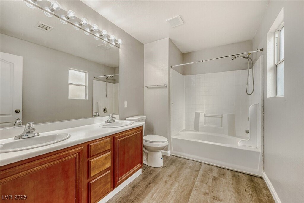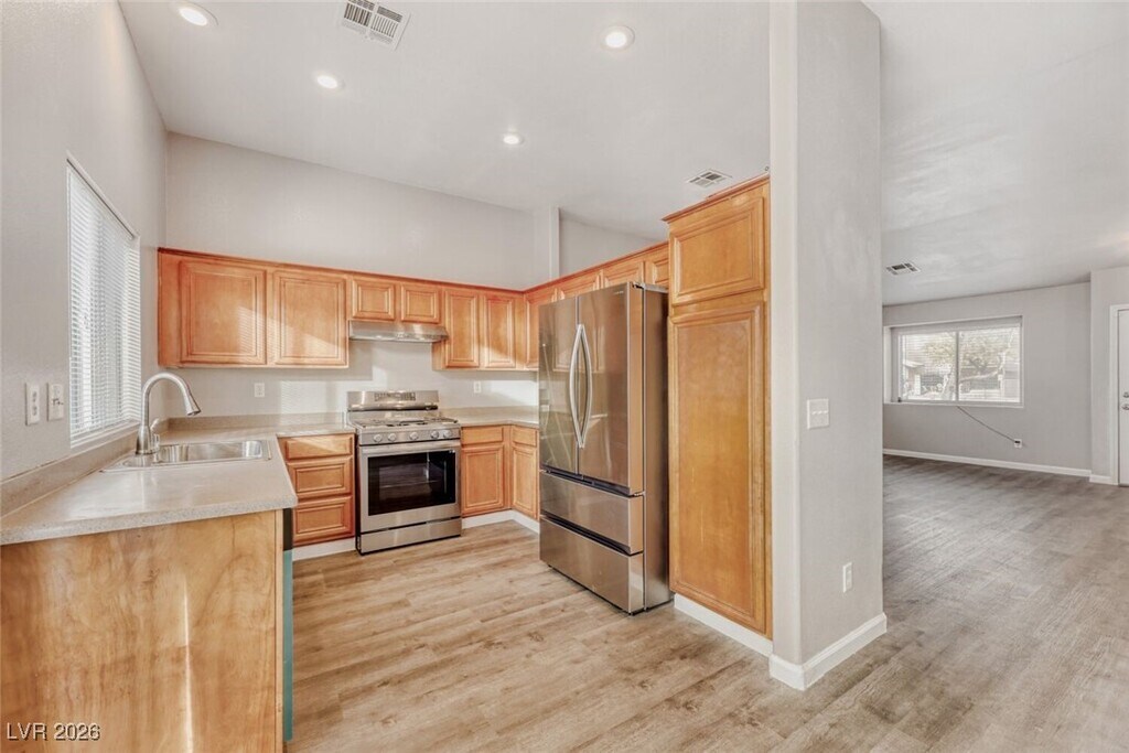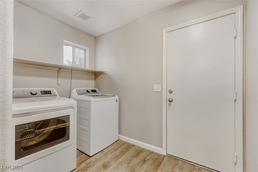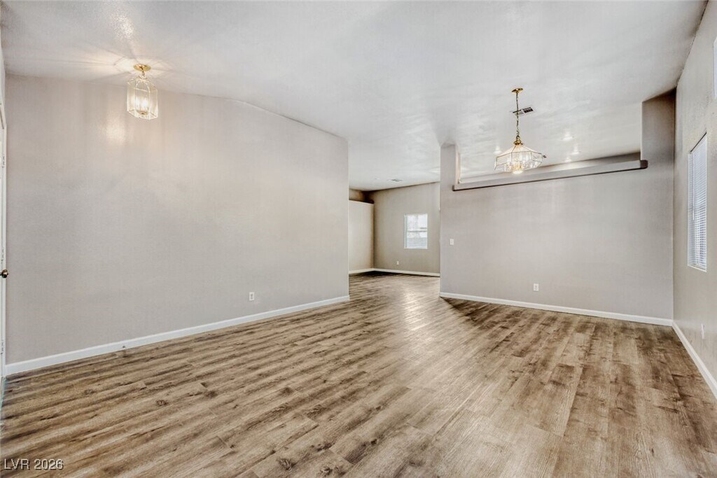 Welcome to this beautiful 3-bedroom, 2-bathroom home in North Las Vegas, NV. This property boasts a spacious backyard, perfect for outdoor activities and entertaining. Step inside to discover new vinyl flooring throughout, providing a fresh and modern feel. The open floorplan allows for seamless transitions between rooms, creating a sense of unity and space. The kitchen is equipped with new appliances, ready for your culinary adventures. Featuring a separate dining room with an upgraded light fixture. The primary bedroom features an en suite bathroom with dual sinks and a tub-shower combo, offering a private retreat within the home. A separate laundry room with a washer and dryer included adds convenience to your daily routine. The home has a park nearby for recreation and the beautiful Desert Horizon Park just a short distance away. As an extra added perk, Water, Trash, Sewer and Tenant Portal Fee are included in rent!