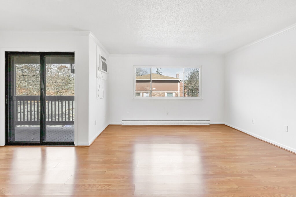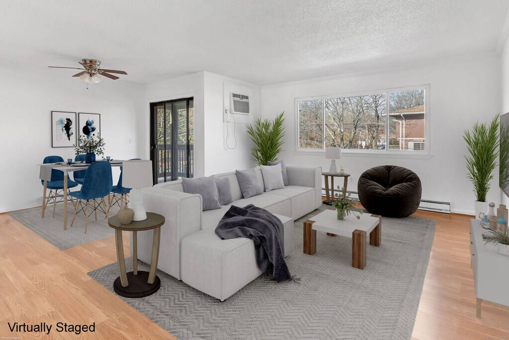 Call for Availability - Beautiful 2nd-Floor Mint Condition 1 Bedroom, 1 Bathroom Ranch-Style End Unit in the North End of Bridgeport! This sunny and meticulously maintained end-unit ranch offers comfortable, easy living with modern updates throughout. Enjoy an open-concept living/dining area featuring laminate flooring, a ceiling fan, a new wall A/C unit, and sliders leading to a private balcony. The insulated living room window is only about 3 years old, helping keep the home energy efficient. The spacious primary bedroom includes a ceiling fan, a generous closet, and its own wall A/C unit. The kitchen features a 3-year-old stove and a brand-new dishwasher, while the full bathroom has been refreshed with a new vanity and a fiberglass tub enclosure. Additional conveniences include in-unit stackable laundry and two-zone heat. A designated parking space (#54) is conveniently located near the pool. MLS# 24141661
