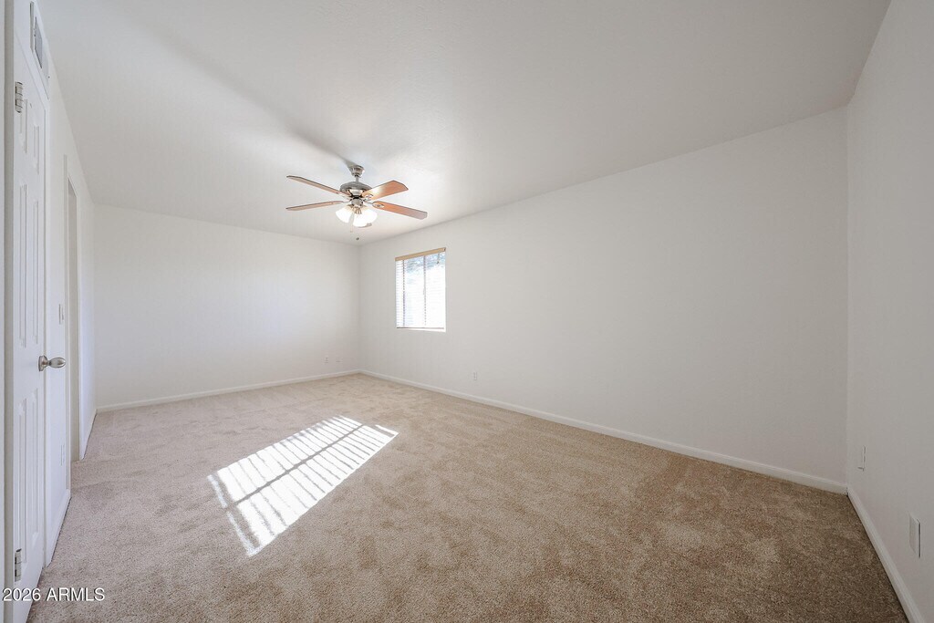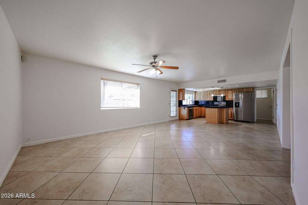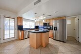 Spacious home is located in a quiet interior street in a great neighborhood! Kitchen opens to family room and offers hickory cabinetry with huge island,new stainless steel appliances,& brushed nickel lighting. 20'' tile in kitchen,living dining/great room,hall and bathrooms,new carpeting in Primary bedroom,Laminate in secondary bedrooms. new interior paint throughout,ceiling fans in every room. Large master bedroom has walk-in closet. Huge backyard has grassy area with curbing and sprinklers. No Cats,small/med bred dog