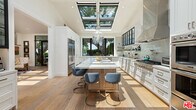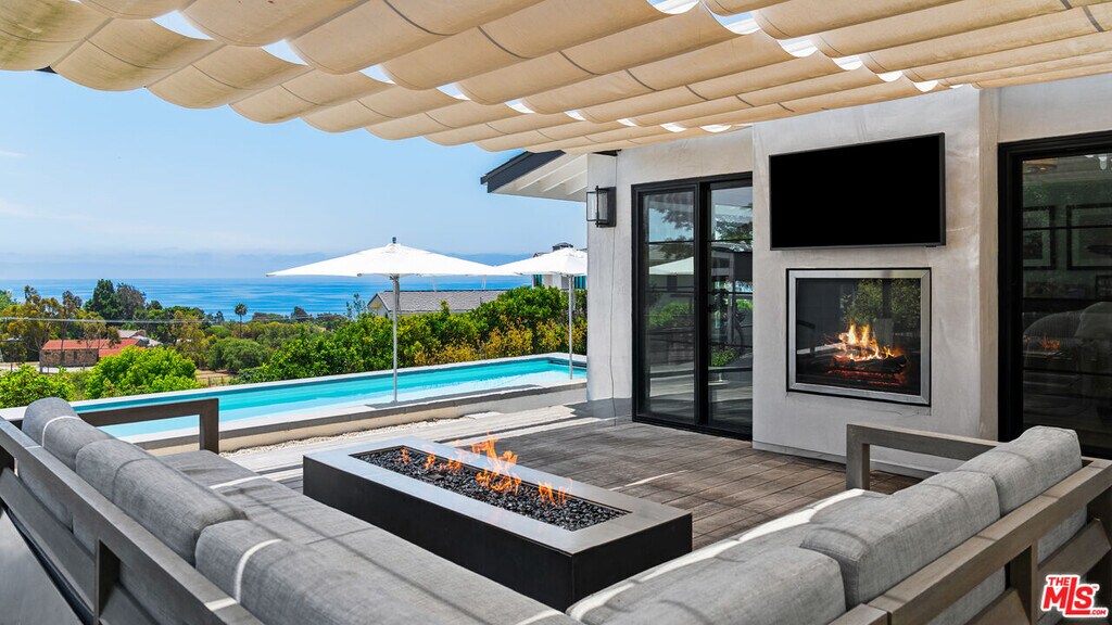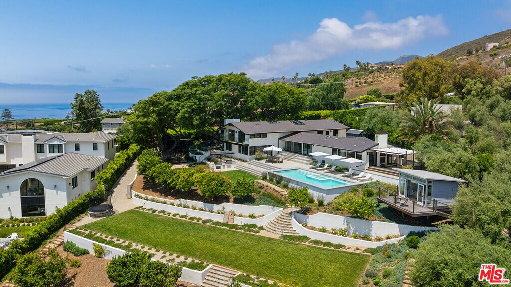 Tucked behind gates and lush privacy hedges, this stunning coastal smart home welcomes with manicured landscaping, stone pavers, a bubbling fountain, and a modern glass-and-metal front door. Inside, a skylit foyer with wood floors and a sitting area sets the tone for warmth and sophistication.Step up to the living room, where wide sliding glass doors frame sweeping ocean views. A stone fireplace, built-in speakers, and hardwood floors create a relaxed, elegant setting. The home is outfitted with a Lutron lighting system and Sonos audio, offering seamless automation throughout.The adjacent chef's kitchen is fully equipped with Thermador appliances including a six-burner range, BBQ, double ovens, and warming drawer. A spacious island with bar seating, mini fridge, and Bosch dishwasher anchors the room. Glass-and-metal cabinetry, built-ins, and a cozy breakfast nook with a skylight complete the space.Continue to the two-car garage with custom storage and the laundry room with stone counters, Samsung appliances, and sink. Nearby, a private lower-level suite offers a spacious bedroom and separate living/play area with a spacious closet, backyard access, ocean views, and a fireplace. The en suite bath features marble counters, a tiled shower with dual showerheads, and custom built-ins.Upstairs, the formal dining room opens to a tranquil patio with a fish fountain. Along the hall, a guest bedroom features hardwood floors, a hanging chair, built-in desk, and triple French-door closets. A nearby bath offers a skylight, marble floors, rainfall shower, and custom stone vanity.At the end of the hall, the primary suite is a true retreat. Vaulted, beamed ceilings crown a spacious bedroom with wood floors, a sitting area, and double-sided fireplace. Glass sliders open to a private patio with ocean views, a sectional lounge with firepit, Pilates reformer, and waterfall feature. Inside, the luxurious bath includes a freestanding tub, large steam shower with dual showerheads, marble makeup vanity, double sinks, and a water closet with bidet. Closet space is generous and fully built out.Outside, terraced stone paths wind through citrus trees, succulents, and lush lawns. The backyard includes a Tagwood rotisserie, DCS grill, and a covered dining area beside a large rectangular pool and in-ground hot tub all with panoramic ocean views. Below, another lawn leads to fruit trees and a shaded stone dining nook. Nearby is a full animal enclosure currently housing dogs, pigs, and bunnies.A detached studio office offers panoramic ocean views, wood floors, two desks, French doors, and its own deck, which is ideal for work, creative space, or a serene guest escape. Surfboard storage lies below. An outdoor shower and private sauna off the primary patio complete this extraordinary compound, where no detail is overlooked and every space is designed to elevate coastal living. MLS# 25569999