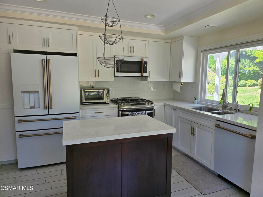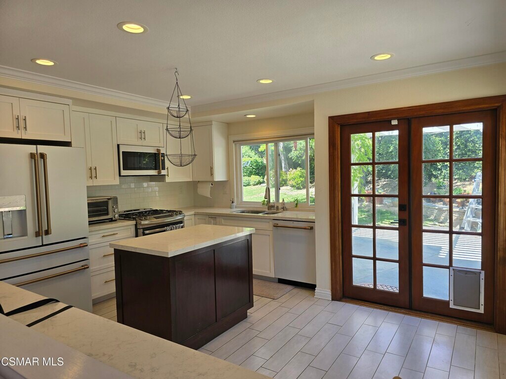 Must see this gorgeous 5 bedroom+3 bathroom pool home in a quiet cul-de-sac in the desirable Indian Hills neighborhood of Simi Valley. Featuring a light and bright, open floor plan which includes high ceilings, dual paned windows, crown molding & trim, recessed lighting, laminate hardwood-like flooring throughout and a whole house fan. The family room features a wet bar, a fireplace and a 75 inch flatscreen tv. The updated kitchen offers designer appliances, a center island, cabinets galore with pull outs & soft-closing drawers, and quartz countertops which adjoins the formal dining room. Outside you will be dazzled by the beautiful, lush, private, resort-style backyard with pool, spa and rock waterfall. Includes wrap-around covered patio, a built-in BBQ and mini fridge, stacked stone terrace, a rose garden, vegetable/herb planters and fruit bearing trees (plums, lemons, limes, avocados, apples, apricot). Side yard can house a small RV, boat or motorcycle. Inside you will find a decorative wrought iron banister which leads to 4 bedrooms upstairs which all have ceiling fans and 2 full bathrooms. The spacious ensuite master bedroom features 2 closets, a retractable skylight, double sink vanity, a separate soaking tub and water closet, and shower stall. Conveniently located near 118 Freeway, parks and recreation, hiking and biking trails, and much more! Easy commute to San Fernando Valley. Energy saving leased solar panels which will greatly reduce your electrical bill. The 3rd car spot in the garage was professionally converted to the 5th bedroom, which can also be well-suited as a home gym, office or studio. No HOA. Welcome to your new home!