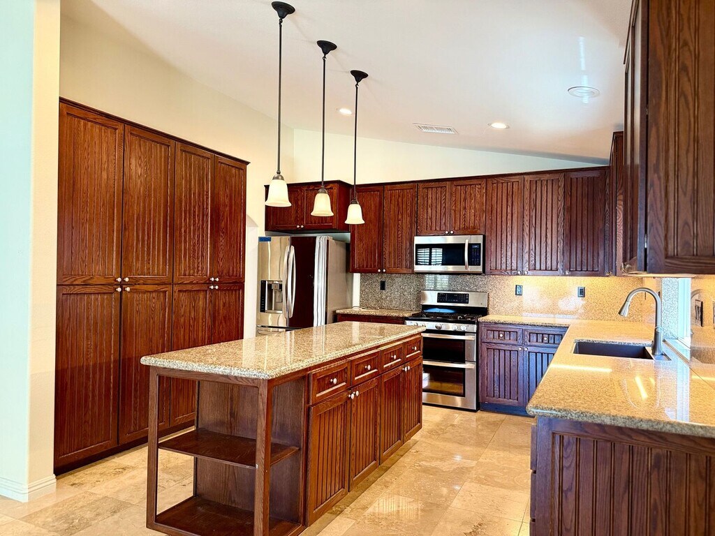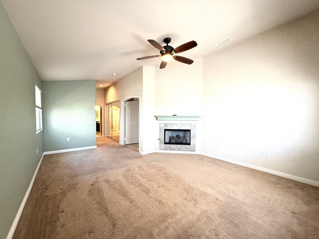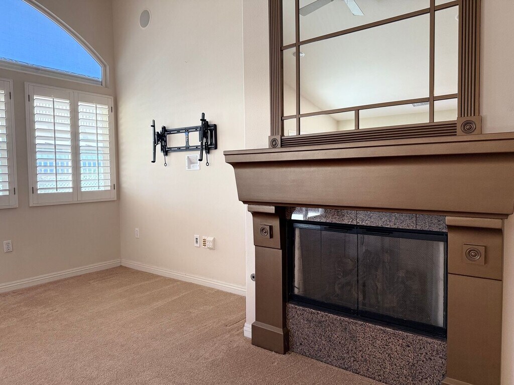 Gorgeous home in the vibrant Four Seasons 55+ community with stunning hillside and city light views. The open layout features a spacious great room with custom fireplace, surround sound, and dramatic architectural details throughout. The kitchen is loaded with upgrades—granite counters, a center island, stainless appliances, and tons of storage. Travertine floors, plantation shutters, and custom finishes give it a polished look. The third bedroom is set up as a den with built-in desk and shelving. The primary suite has its own fireplace and surround sound wiring, plus a spacious bathroom with upgraded cabinetry, custom shower and a separate walk-in tub designed for senior comfort. Additional features include a finished garage with cabinets, workbench, and extra outlets. This home is spotless and located in a resort-style 55+ community with clubhouse, pool, and fitness center. You’ll love it here!