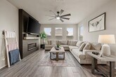 HOUSING VOUCHERS ACCEPTED AND UP TO $1,000 IN MOVE-IN INCENTIVES IF YOU MOVE IN BEFORE DECEMBER 31ST 2025 !!. ASK ABOUT THE WASHER, DRYER, FRIDGE AND TV!! Discover this beautifully maintained home located in the charming community of Heartland, TX. Thoughtfully designed and filled with modern finishes and upgrades, this two-story gem offers both style and functionality for today’s busy lifestyle. As you arrive, you’re greeted by a beautifully landscaped front yard, neutral brick exterior, and an extended driveway leading to a two-car garage with stylish dark trim. Step inside to discover warm wood-look tile flooring throughout the main living areas, creating a seamless flow between the living room, dining space, and kitchen. The spacious living area features a custom-built shiplap accent wall with an electric fireplace — perfect for cozy nights or entertaining guests. The open-concept kitchen is a dream with crisp white cabinetry, stainless steel appliances, sleek grey countertops, modern tile backsplash, and a large island with bar seating. The adjacent dining space is filled with natural light, offering the ideal setting for family meals or casual gatherings. Upstairs, a large flex space offers endless possibilities — game room, media lounge, or home office — with room to grow. The primary suite is located on the main floor and boasts a dramatic feature wall, soft carpet underfoot, and plenty of natural light. The ensuite bathroom includes dual vanities, a spacious glass-enclosed shower, and a walk-in closet. Secondary bedrooms are generously sized and thoughtfully placed, including a guest suite with its own full bath. Each bathroom showcases clean, modern finishes and practical layouts. This home combines modern comforts with stylish upgrades in a family-friendly neighborhood, walking distance to the elementary and middle school, and all within a short drive to Dallas.