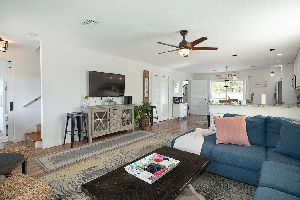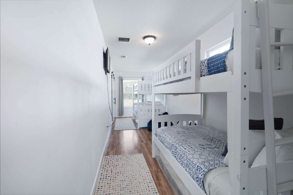 Welcome to Sunshine Lane, where you can relax and enjoy Florida's best features: beach and sun! This spacious 4-bedroom home is just a few minutes' walk to the beach, with direct access from the street. Enjoy the heated pool and plenty of room for your group to spread out, all while feeling at home. The property layout is thoughtfully designed for comfort and convenience. On the first floor, you'll find a cozy living room with a big screen smart TV, an open kitchen and dining space fully stocked for in-home meals, a bedroom with twin bunk beds, bean bag seating, and a TV, and a full bathroom with a walk-in shower. The second floor features a bedroom with a twin daybed and trundle, a bedroom with a queen bed, and a spacious master bedroom with a king bed, daybed with trundle, and an attached full en-suite bathroom. Outdoors, enjoy the heated pool and a propane grill for BBQ by the water. This pet-friendly home accommodates one dog under 50 lbs with a $100 non-refundable pet fee. Guests are responsible for any damages caused by the pet during their stay. Additional charges apply if dog feces is not picked up and properly disposed of. Located less than a 10-minute drive to St. Augustine's historic district, this home offers easy access to local attractions and amenities. Whether you're exploring the historic sites or enjoying the nearby beach, you'll find plenty to do in the area. Quiet hours are enforced between 10 PM and 8 AM per St. Johns County ordinance. The minimum age to book is 25, and the primary guest must be present for the duration of the stay. No parties or large group gatherings are allowed, and any guests visiting outside of the reservation must be approved by the hosts prior to their arrival. The home has an actively recording security camera installed at the front door. No smoking or vaping is allowed on the property, and evidence of smoking will result in an additional cleaning fee. Late check-outs and early check-ins are subject to additional fees. [SI]