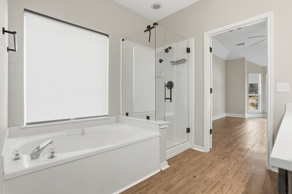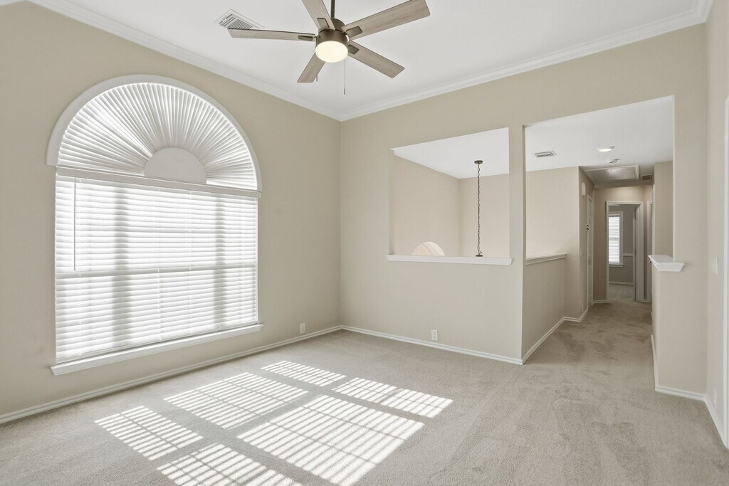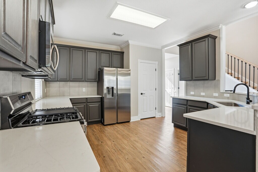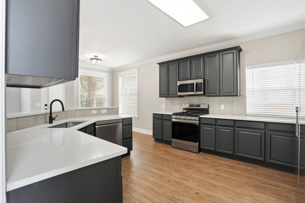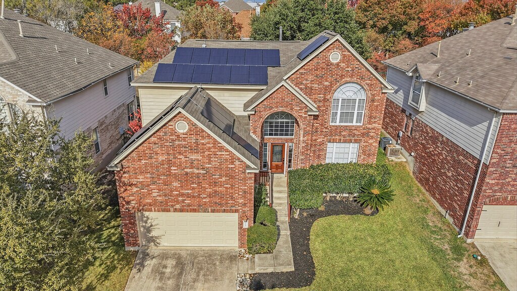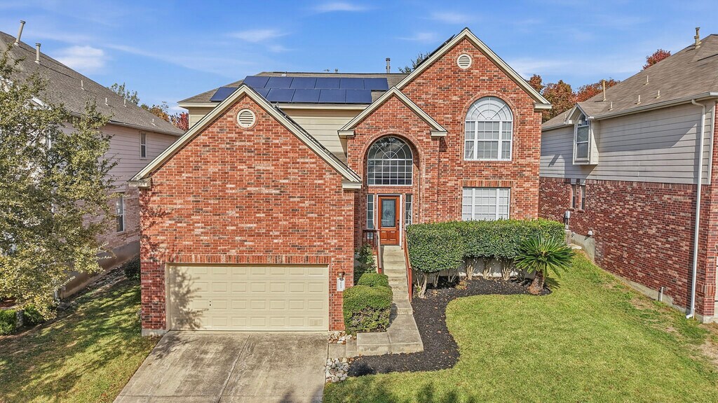 This is a beautiful 4-bedroom, 2.5-bath home in a gated community, in North East San Antonio, and is ready for move-in. The owner has taken great care of this home, which features a whole-home upgrade with tasteful modern finishes, and a solar-power system that greatly reduces energy costs every month (June 2025: $25, July 2025 $88). As you enter the home you'll be greeted by a grand view of the cathedral ceilings above the living area, the beautiful maple wood staircase, and a welcoming chandelier. To your right will be your formal dining room or office space, and to your left will be the entrance to your laundry room and the garage, which can also be suited for a gym, fitness area, or workshop. At the center of the home is your spacious kitchen with new quartz countertops, stainless steel appliances, freshly painted cabinets, and a breakfast bar, all with the convenience of a clear view to the living room TV. Just past the kitchen you'll find your separate breakfast/dining room, as well as the large open living room with cathedral ceilings; a brick, wood-fired fireplace, and large windows across the back of the home, bringing a pleasant amount of sunlight into the home. Your spacious primary suite is on the main floor, featuring vaulted ceilings, natural sunlight, a spacious bathroom with a garden tub; a glass enclosed, frameless shower; dual-vanity sinks, a panoramic mirror, and a spacious walk-in closet. Outside the home, you'll enjoy a covered patio with outlets, the serene feel of nature with mature trees throughout the privacy-fenced backyard, an irrigation sprinkler system, and pleasant walks around your gated neighborhood. Schedule your showing today! Applications will be reviewed on a first come, first serve basis.