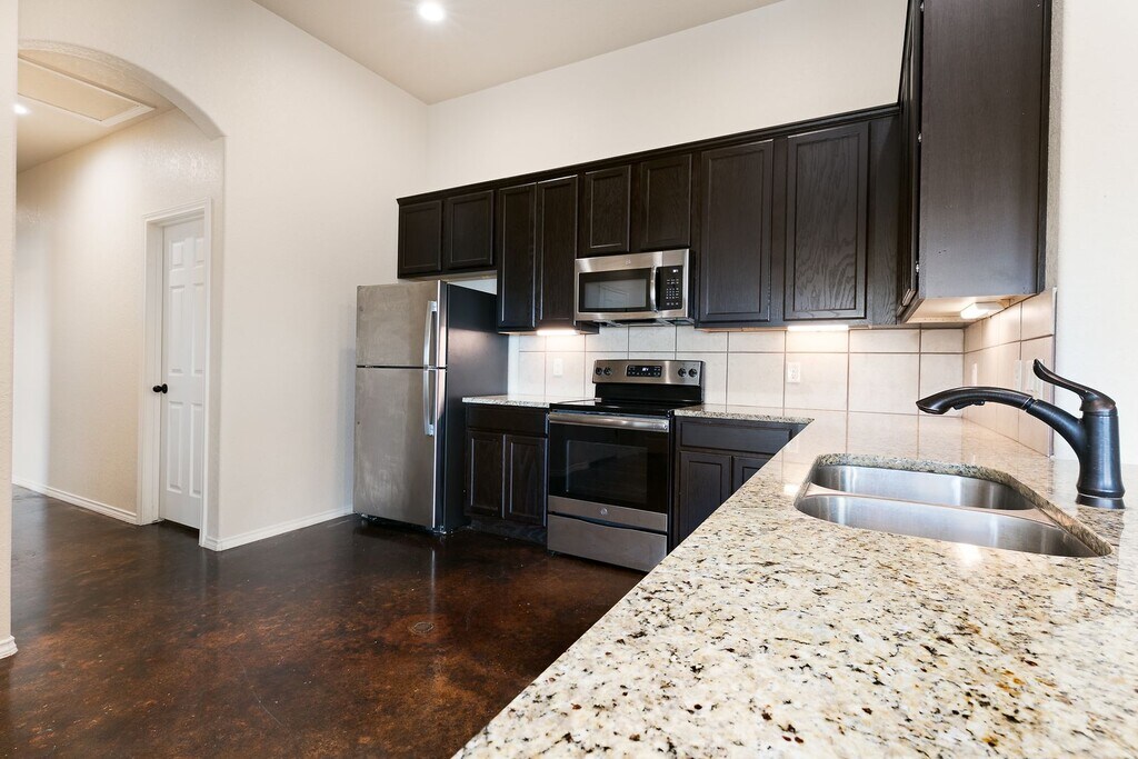 Available for immediate move in! 3 bedroom 2 bath luxury duplex with stained concrete flooring and high ceilings throughout the entire home. Open contemporary floorplan offers fully equipped kitchen with granite counter tops, stainless steel appliance package including fridge, microwave and under cabinet lighting with a separate pantry. Utility room inside offers full size washer and dryer connections. Master bedroom offers decorative tray ceilings with ceiling fan, walk in closet and private bath with stand up shower. This home is located on corner lot with rockscaped front lawn for easy maintenance. Spacious back and wide side yard with covered patio. Outside patio access off master bedroom to enjoy the cool evening breeze. Pets welcome! Limit 2 pets with pet deposit, one-time pet fee and monthly pet rent.