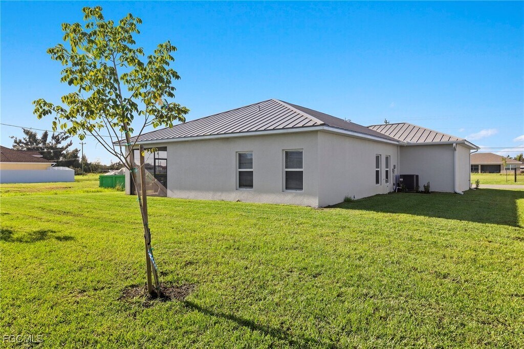 NEW contruction home,3-CAR GARAGE home with a fenced backyard. This property boasts 4 bedrooms (Or 3 + study),2 baths fully fenced backyard and is located in the heart of Cape Coral. This home features many impressive upgrades including laminate flooring throughout along with 42-inch wood cabinets with soft close hinges and drawers. Metal roofs are not only attractive but also extremely durable in storms. The beautiful granite countertops and tile backsplash bring together the kitchen atmosphere with a sense of style and class. The 10-foot breakfast bar countertop can easily accommodate 5 bar stools. Lots of working space along with upgraded stainless steel appliances complete this spacious kitchen. There are ceiling fans in all bedrooms with a screened-covered lanai. The home has an indoor laundry room WITH a washer and dryer included! Lawncare can be included in your rent with a minimal increase. Rest at ease renting our homes with our superior customer service experience. We believe in building a solid,quality home. We believe in providing an excellent,convenient location. We have several homes nearly completed with more under construction. Choose from several move-in dates and addresses. Photos are of model homes not actual homes and have been virtually staged.