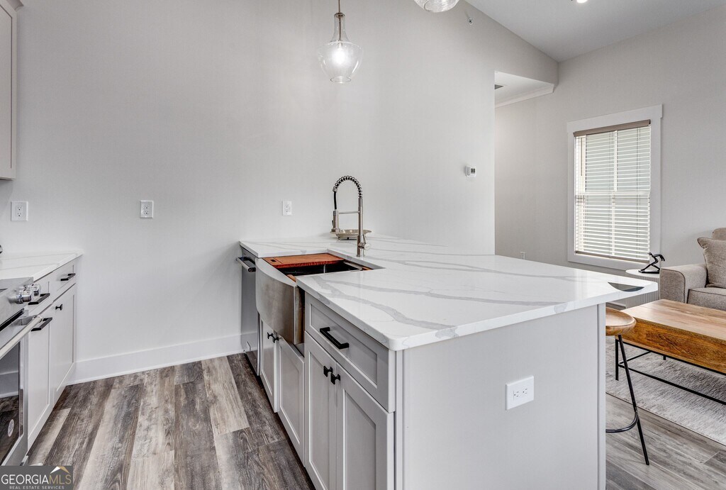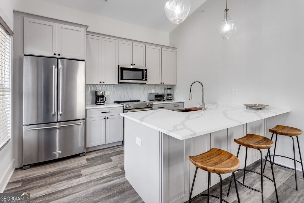 UTILITIES INCLUDED (Unfurnished) Right in the heart of Peachtree City-new construction in a live/work community. The apartment is upstairs and is a one-bedroom/one-bath with all the comforts of home: hardwood floors, quartz countertop, and an open kitchen with an island/bar. Two patios provide lots of space to enjoy the outdoors. The space is full of windows and natural light-access to over 100 miles of golf cart trails. Only a 8-month lease is required. The rental is only the upstairs apartment. The apartment is available March 20th. Call from more information. Rental rate comes with these utilities (electric, water, trash, HOA / But tenant must set up their own wifi account). Landlord's Rental Requirements: Minimum 675 FICO score, Rental Application, 2 most recent Paystubs & Bankstatements, Photo ID. Income requirement: 2.5 X's monthly rental rate, verifiable income. Rental application is through Rent Spree. *3-D tour and walk through video available. Apartment does come with large, newish TV installed on the wall in the livingroom on a mount that allows it to turn different directions. MLS ID 10703387