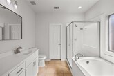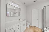 Light and bright home with the most desirable floorplan: primary bedroom is downstairs while the 3 guest bedrooms are upstairs. Fresh paint, tile and laminate floors in all the living spaces, and new carpet in the bedrooms give a neat and clean feel. Conveniently located close to schools (just 0.6 miles from Caprock Elementary) and 0.6 miles to one of the 6 community pools. The neighborhood also boasts a state-of-art community newly renovated amenity center, 2 half basketball courts, sand volleyball court, plus ponds and miles of greenbelt trails. New range and microwave installed in September, 2025. This home is move-in ready!