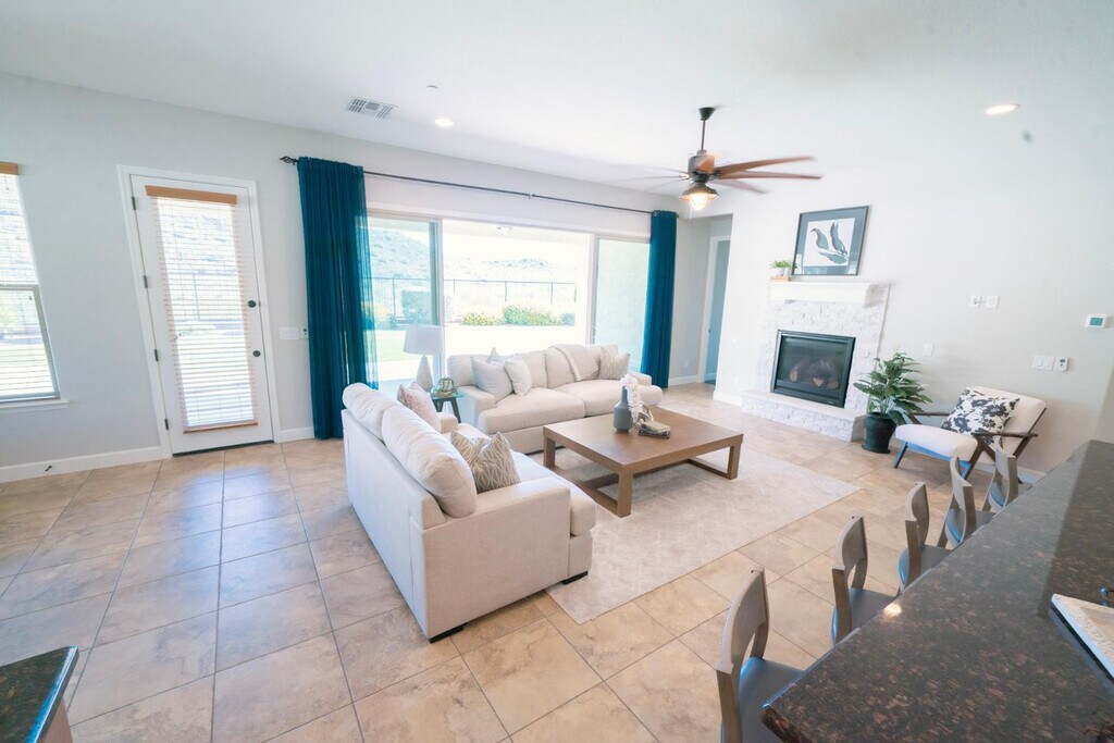 Step inside this 4 bedroom,3 bath home,with a den that features a gas fireplace,gourmet kitchen,BRAND NEW BEDROOM CARPETS,modern layout ideal for hosting guests in the heart of Vistancia. Each bedroom features large closets,including a 2nd in-law suite. Experience true indoor/outdoor living with expansive double sliding glass doors that open to patio and low maintenance backyard overlooking the mountains. Additional highlights include epoxy-coated garage floor,over head storage,water softener system,built in security system,paver driveway leading to RV gate and rear yard access. The property is available for a 3 month,6 month,or 12 month lease. Any lease less than 12 months is $3100.00/month. The property is available starting July 3,2026