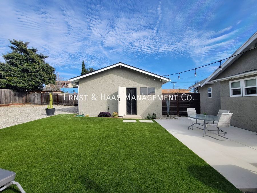 Discover the epitome of coastal living in this stunning bungalow home, meticulously maintained and thoughtfully upgraded. Situated on an inside track location, the home beckons with a long driveway, expansive front and rear yards, a lovely patio, and a large 2-car garage. Embrace eco-friendly living with drought tolerant landscape, in both the front and rear yard, with multiple lounge areas, great for an afternoon BBQ, or a quiet evening wind-down Step inside, where the interior unfolds in classic California Bungalow Charm. An open living room entry with rich hardwood floors, a ceiling fan, and lots of windows leads to the recently remodeled gourmet kitchen. The kitchen boasts ample counter space, including a small breakfast bar with seating for 2, a stainless steel stove, microwave, and refrigerator, and ample cabinets for all your culinary needs. Adjacent to the kitchen is a separate service porch with a side-by-side washer and dryer and a door that leads to the rear yard. Both bedrooms are nicely sized and share a large wardrobe closet, with a remodeled bathroom. Enjoy the convenience of gardening services included! Make this lovely home yours-contact us today! This property is equipped with a Codebox and can be viewed via the ShowMojo scheduled self-guided tour. To schedule a showing from the Ernst and Haas Management website, click on “Schedule a Showing”, then select a date and time from the ShowMojo available time slots. For more information on this or any other available property, please contact Ernst & Haas Management at , or visit us online at