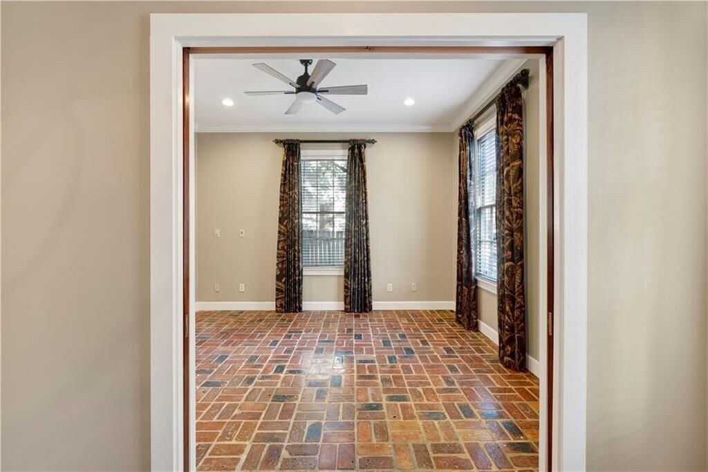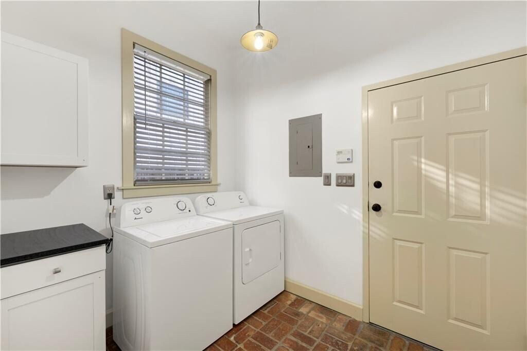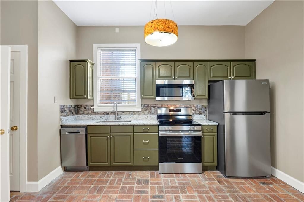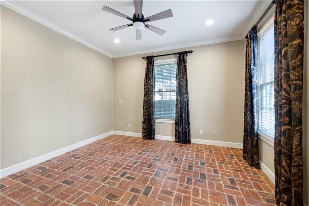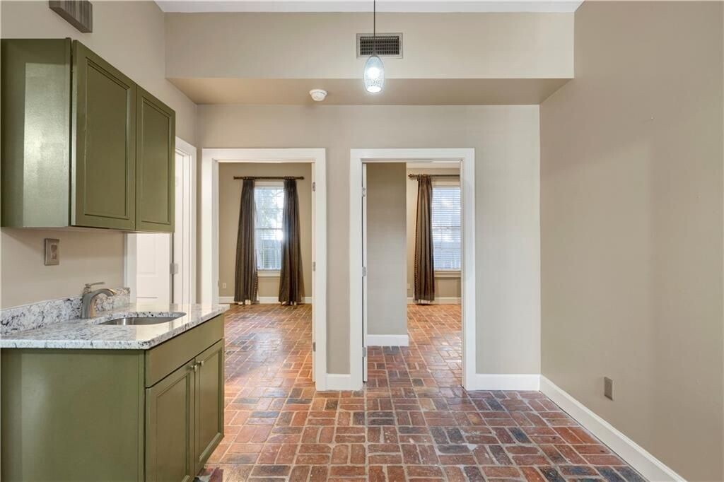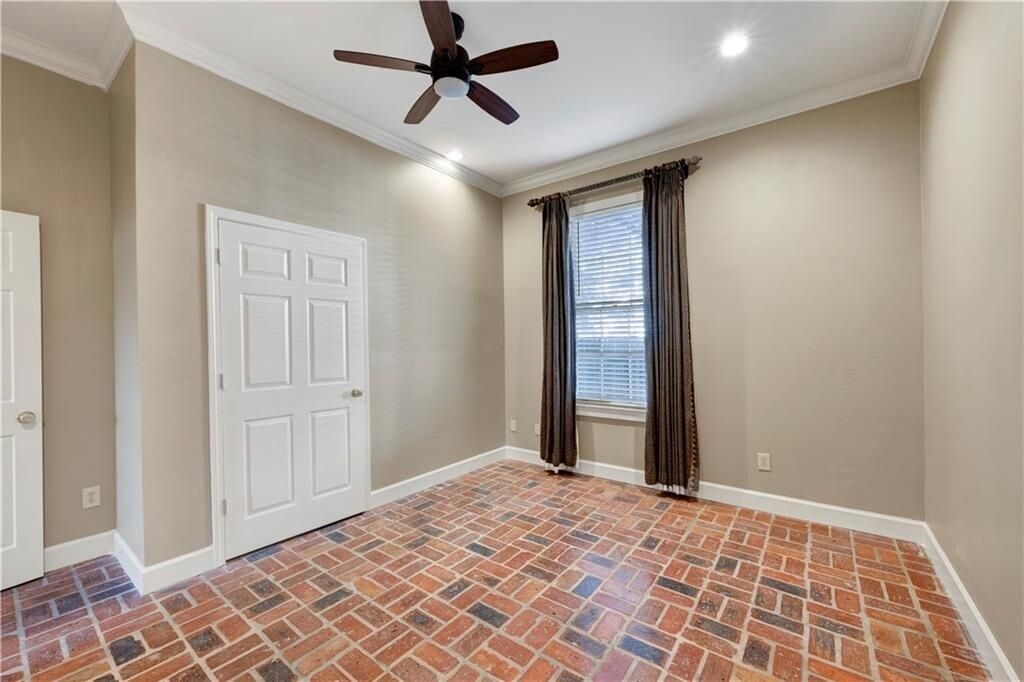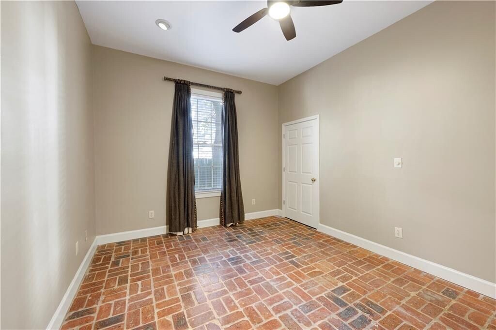 Experience refined downtown living in the heart of the DeTonti Square Historic District, widely regarded as one of Mobile's most coveted and architecturally rich neighborhoods. This Federal-style brick residence is freshly renovated, including fresh interior paint, new HVAC, all-new appliances, and new granite countertops, brick flooring, seamlessly blending historic character with modern comfort. The home offers two generous bedrooms, a separate den with pocket doors, and a formal dining room, providing flexibility for both everyday living and entertaining. A large dedicated laundry room—complete with a brand-new washer and dryer—adds a level of convenience rarely found in historic rental homes. Timeless brick and slate flooring, soaring 10-foot ceilings, and solid masonry construction create an atmosphere of elegance and permanence throughout. Best of all, enjoy the luxury of off-street parking in a walkable downtown setting.Just steps from restaurants, art galleries, parks, and all that downtown Mobile has to offer—this is classic DeTonti Square living at its finest.