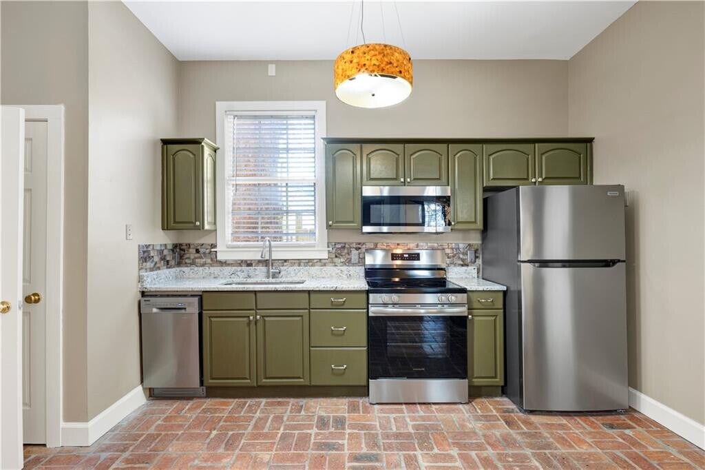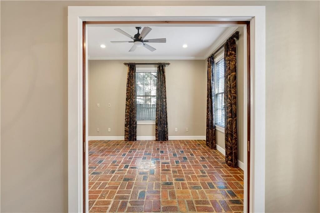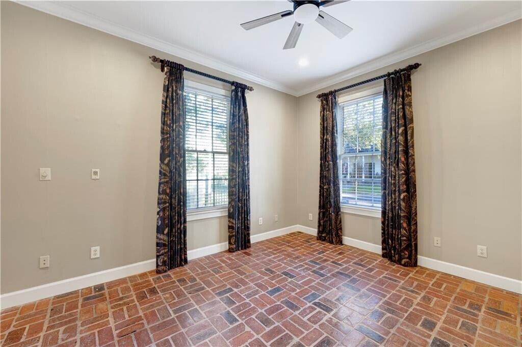 Experience refined downtown living in the heart of the DeTonti Square Historic District,widely regarded as one of Mobile's most coveted and architecturally rich neighborhoods. This Federal-style brick residence is freshly renovated,including fresh interior paint,new HVAC,all-new appliances,and new granite countertops,brick flooring,seamlessly blending historic character with modern comfort. The home offers two generous bedrooms,a separate den with pocket doors,and a formal dining room,providing flexibility for both everyday living and entertaining. A large dedicated laundry room—complete with a brand-new washer and dryer—adds a level of convenience rarely found in historic rental homes. Timeless brick and slate flooring,soaring 10-foot ceilings,and solid masonry construction create an atmosphere of elegance and permanence throughout. Best of all,enjoy the luxury of off-street parking in a walkable downtown setting.Just steps from restaurants,art galleries,parks,and all that downtown Mobile has to offer—this is classic DeTonti Square living at its finest.