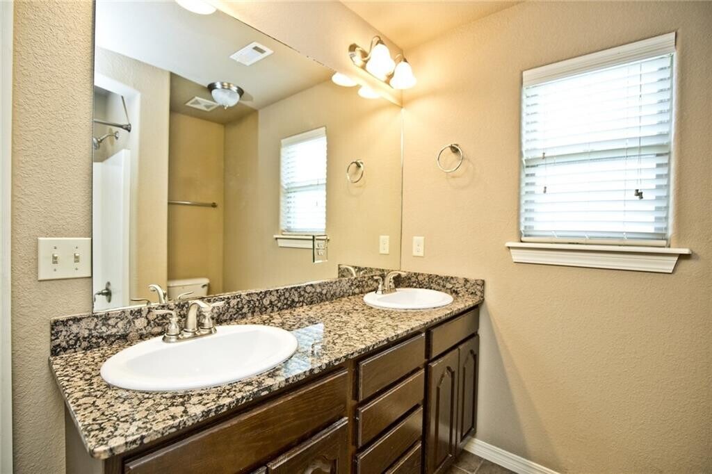 Great location! 3 bedroom, 2 bathroom brick home in Cobblestone Crossing. This home has 9' ceilings, granite counter tops, crown molding, hardwood Laminate flooring through living room and master bedroom, carpet in other bedrooms. Gas fireplace in living room, stainless steel appliances. Master suite offers gorgeous trey ceiling, walk-in closet, his and her sinks and whirlpool tub & shower combo. Large privacy fenced in backyard with covered patio. Walking distance to Holcomb School & park with pond. MLS# 1329832