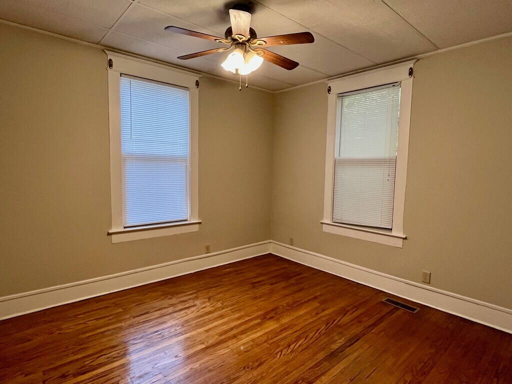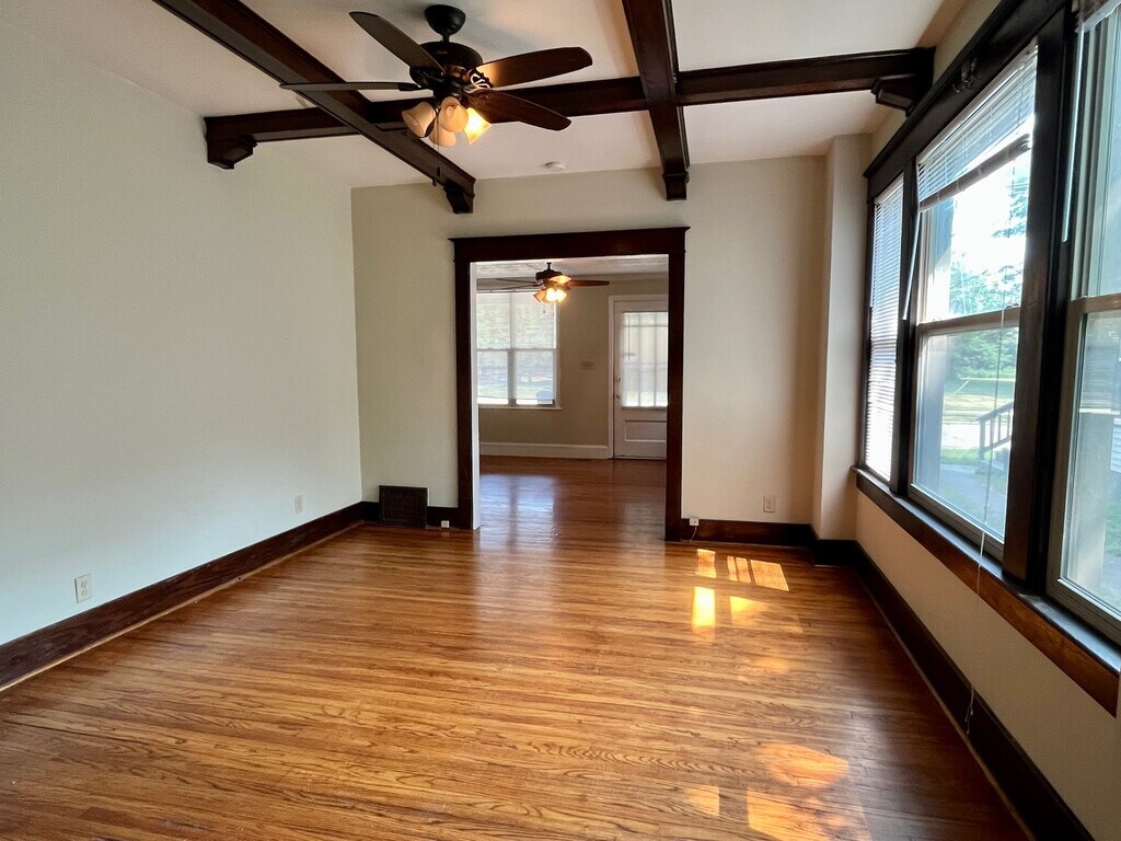 2 bedroom, 1 bathroom house. Featuring a large brick front porch, original hardwood floors, decorative stone fireplace, a designated dining room with beautiful wood ceiling beams, and full bathroom with 2 sinks. Full unfinished basement with washer & dryer hookups. Updated kitchen with newer appliances and a dishwasher. Hardwood floors in living room, dining room, two bedrooms and hallway. Ceramic tile in bathroom and kitchen. Customer pays for electric, gas, water/sewer, and trash services. Owners provide lawn care, snow removal, and maintenance services. The large open lot across the street is also owned by property management as additional green space for our tenants!