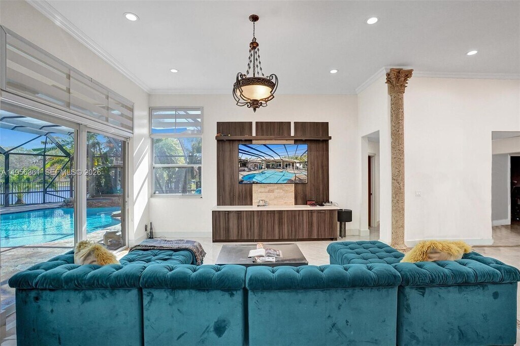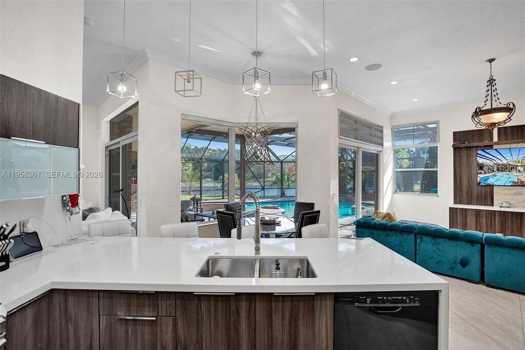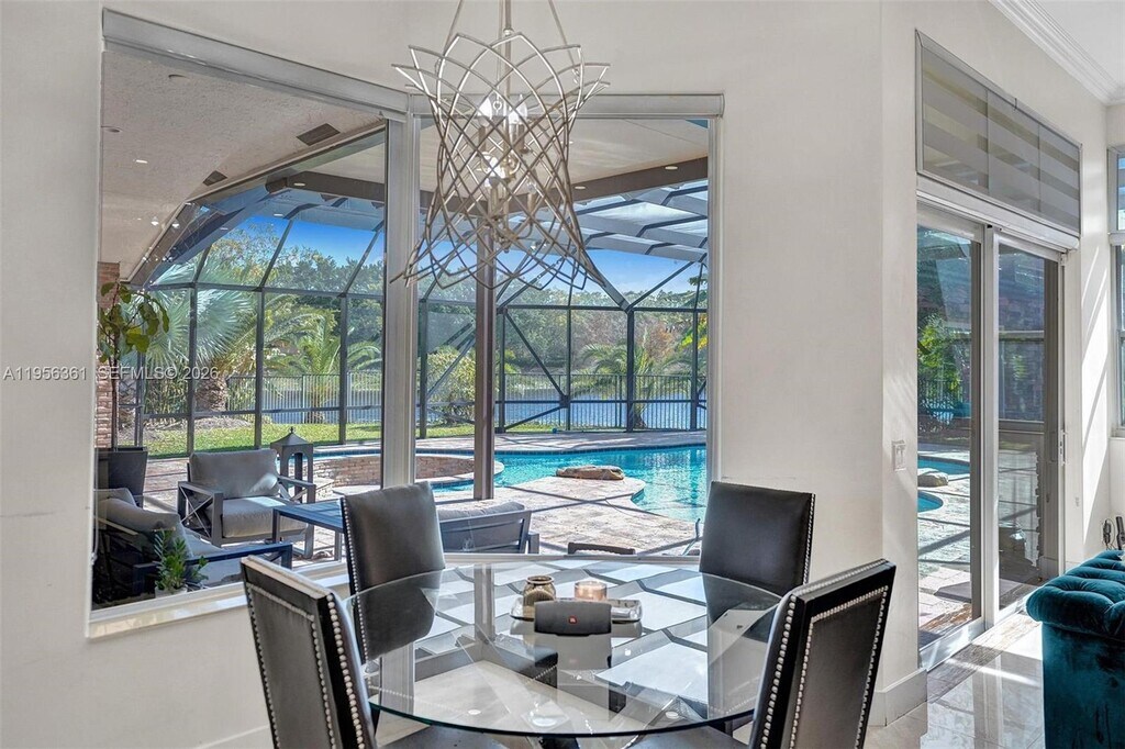 Exceptional private estate nestled on a quiet cul-de-sac with breathtaking lake views. This refined ranch-style residence offers 5 bedrooms plus office/study, 4 bathrooms, and a 3-car garage, including a junior suite ideal for guest quarters. Designed for resort-style living, the expansive screened outdoor oasis features a lagoon-style pool and entertainment wet bar, surrounded by lush, professionally landscaped grounds with complete privacy and designer lighting. A grand entrance showcases soaring volume ceilings, modern-contemporary elegance, and gleaming marble and tile floors. The gourmet kitchen with breakfast nook flows seamlessly into formal dining and living spaces. Triple-split floor plan ensures privacy throughout. The luxurious primary suite is a true retreat with dual walk-in closets, a custom shoe closet, and a spa-inspired bath with Roman tub and separate shower. New roof, impact glass throughout, and solar water heater.A rare offering delivering timeless sophistication and elevated indoor-outdoor living. In the Heart of Weston-The Landings. Located close to highways, entertainment, shopping & dining. Available April 1, 2026. MLS # A11956361