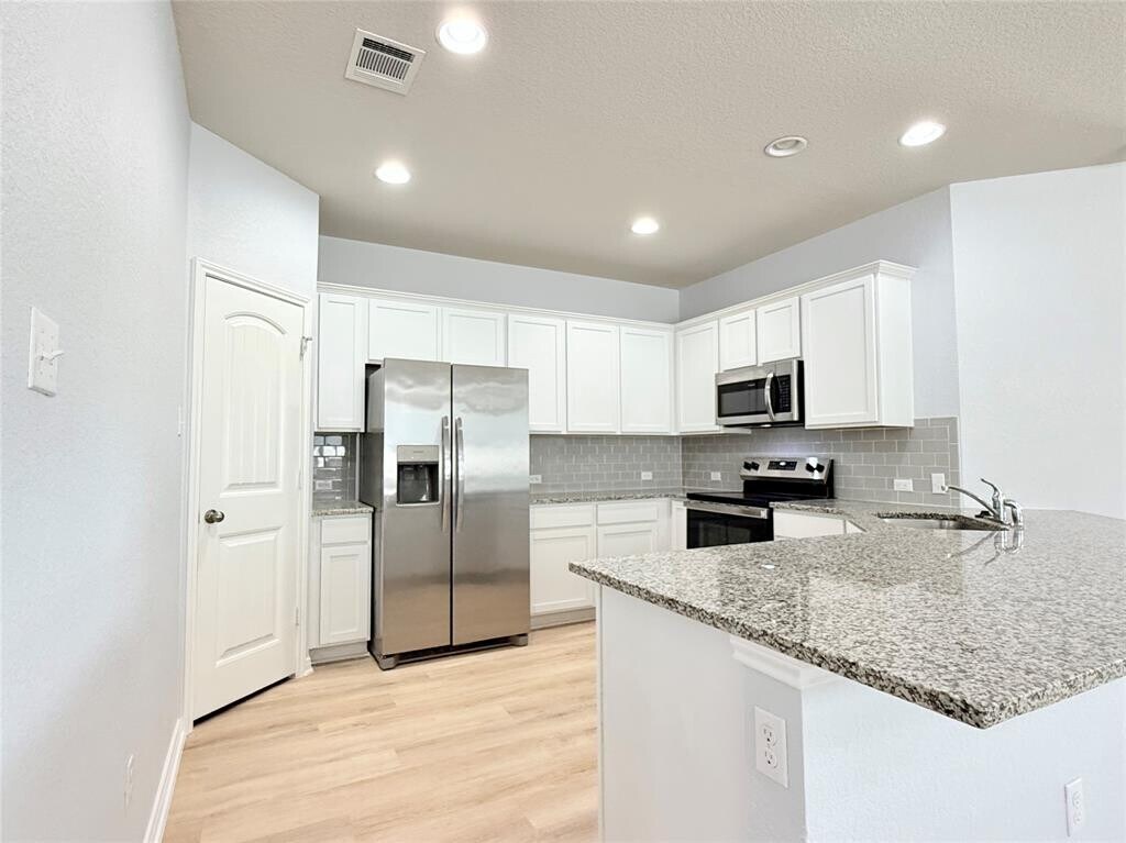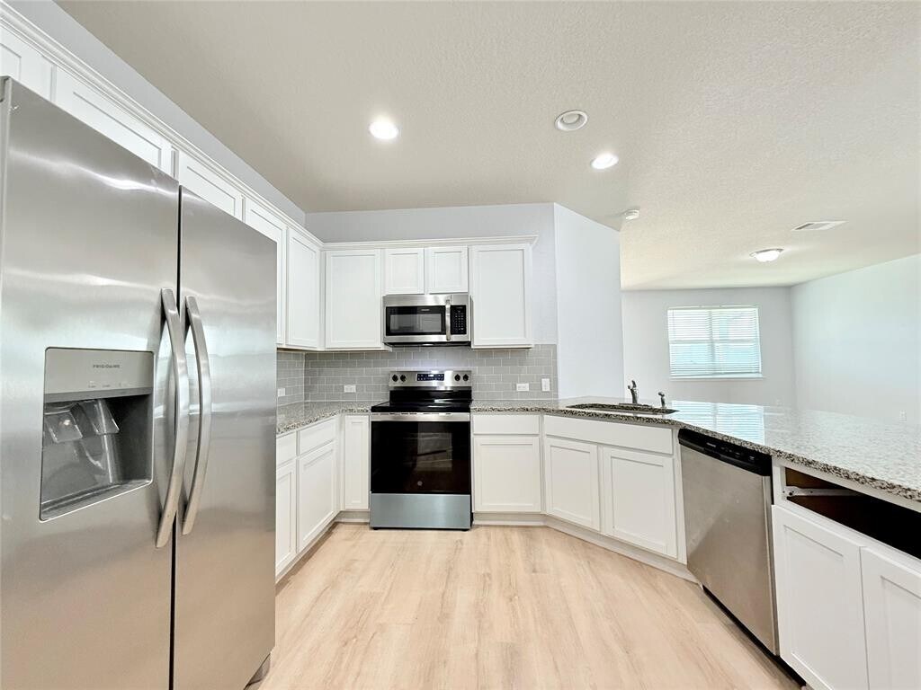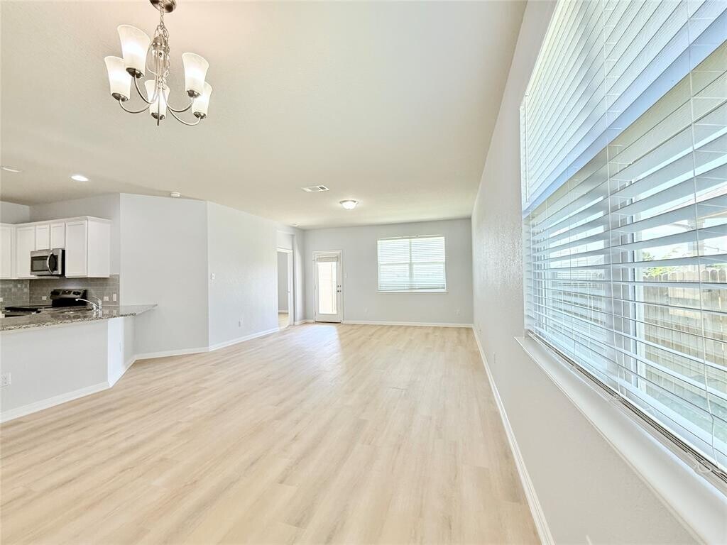 Stunning one-story home featuring 4 bedrooms and 2 bathrooms, designed with an open floor plan that maximizes space and natural light through numerous windows. The modern kitchen boasts granite countertops, and the home is complemented by durable vinyl plank flooring throughout. Enjoy outdoor entertaining on the covered patio, perfect for gatherings and relaxation. Conveniently located with easy access to SH 130, 45, HEB, Costco, outlet malls, and major employers. Residents also have access to community amenities. This home is truly move-in ready!