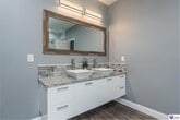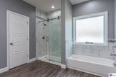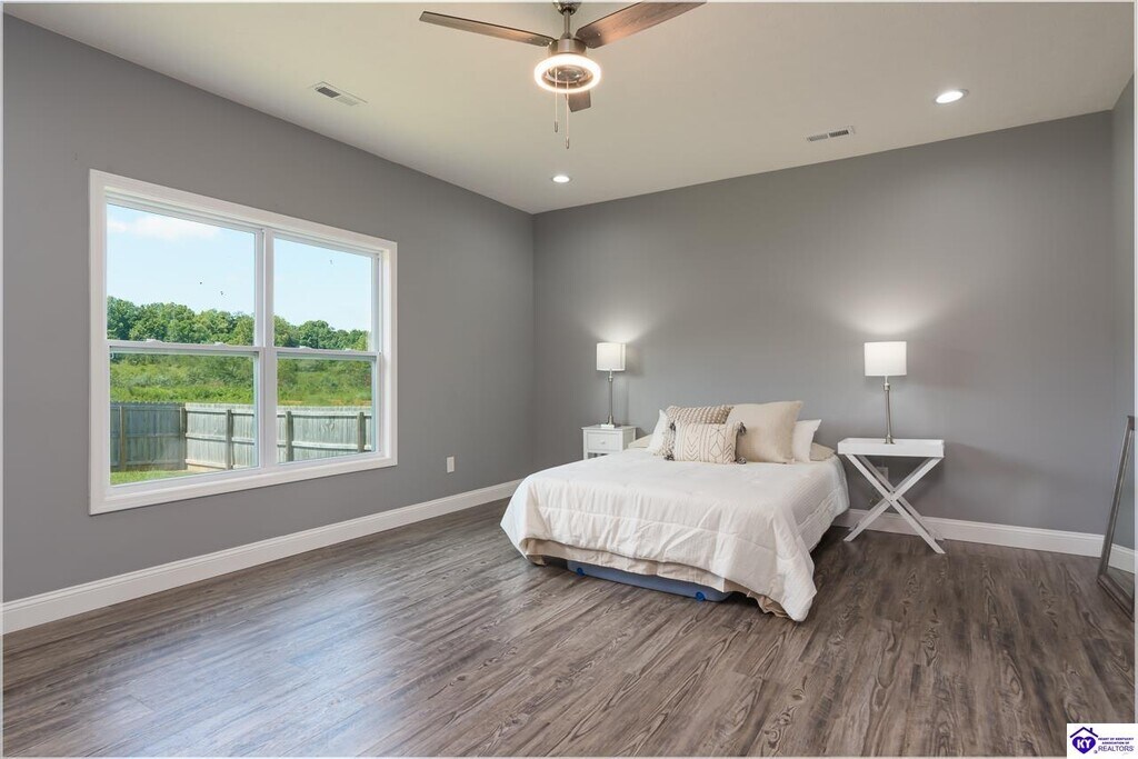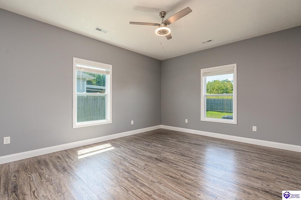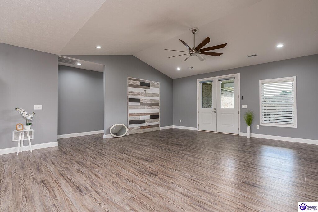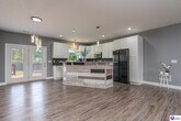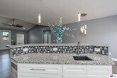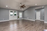 This contemporary single-story residence offers 2063 sq. ft. of thoughtfully designed living space. The home features three bedrooms, including a generous primary suite, and three bathrooms. The open-concept layout seamlessly integrates the kitchen and living areas, ideal for modern lifestyles. Throughout the home, vaulted ceilings and large windows create an airy, light-filled ambiance. The sleek kitchen boasts white cabinetry, granite countertops, and a unique island with rustic wood accents. Stylish pendant lighting and stainless steel appliances complete the modern aesthetic. The bathrooms are elegantly appointed with double vanities, granite countertops, and large framed mirrors. The bedrooms are spacious and well-lit, with the primary bedroom featuring an en-suite bathroom and walk-in closet. Durable wood-look flooring runs throughout the home, providing a cohesive and low-maintenance surface. The neutral gray wall color serves as a versatile backdrop for various decor styles. Modern fixtures, including ceiling fans and recessed lighting, enhance the overall contemporary feel. Storage is ample, with a walk-in closet featuring built-in shelving and hanging space. The home's layout includes two hallways for easy navigation between rooms. Located at 306 Turner, this residence combines style, functionality, and comfort in a well-designed package.