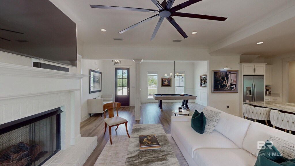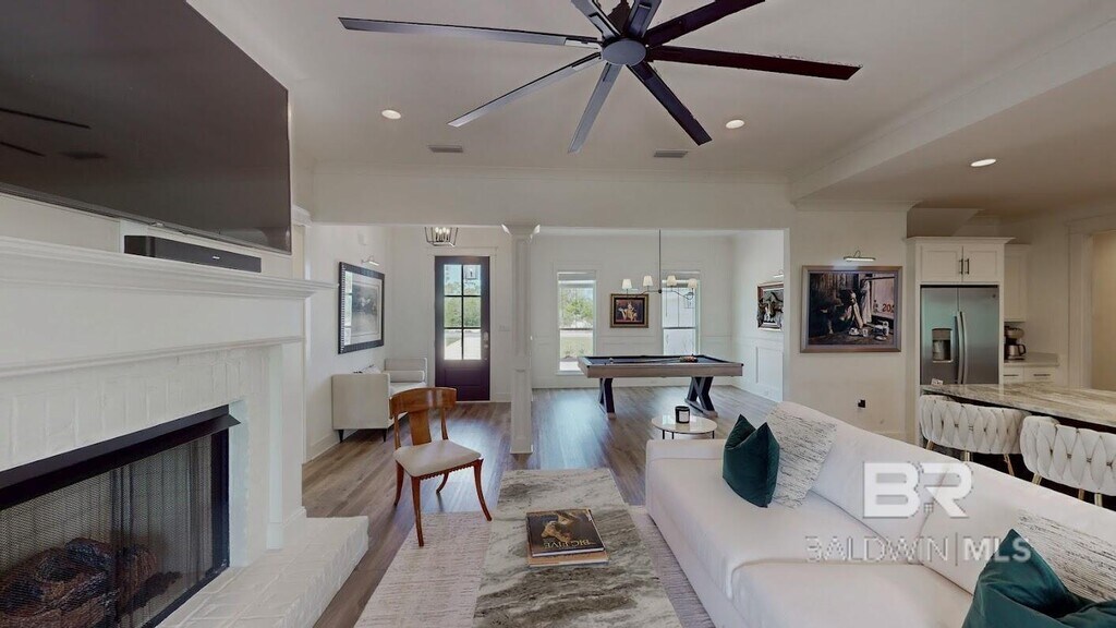 Your private gated Ono Island oasis awaits! Nearly new,4-bedroom,3.5-bath blends city sophistication w/tranquil beach living. Fully furnished for turnkey experience with a pool table. Clean,modern design & open floor plan,highlighted by custom-painted doors for a sophisticated touch. An entertainer's dream,featuring a stunning dolomite stone waterfall kitchen island overlooking the living/dining area w/bar nook perfect for unforgettable gatherings. Community pool,gym,tennis/pickleball/basketball courts just a block away 24/7 security,boat ramp & more. Welcoming deck extends to pavered patio for al fresco dining. Luxurious primary suite w/tranquil soaking tub & expansive walk-in closet. 2 additional beds w/en-suite baths.