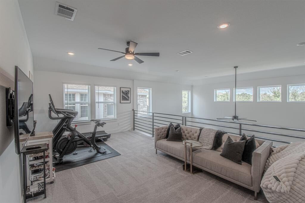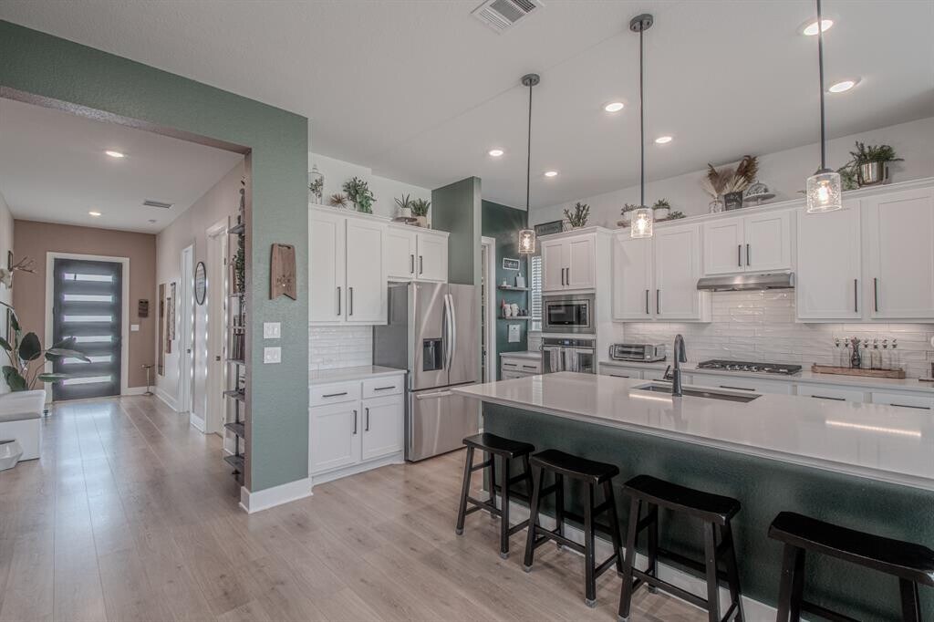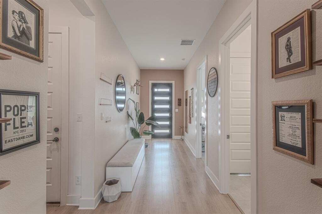 Better than new in Parmer Ranch—don’t wait to build! This turnkey 5-bedroom, 4-bathroom home features 3,068 square feet of thoughtfully designed living space with high-quality modern finishes and seamless flow. The open-concept main level is anchored by the impressive chef’s kitchen with oversized island, built-in oven and microwave, gas cooktop, walk-in pantry, quartz countertops, and other premium finishes. The bright living room boasts tall windows, soaring ceilings, and a stunning wall of sliding glass doors that seamlessly connects the indoors and outdoors. Just beyond, a covered patio ensures year-round enjoyment, offering the added privacy of no rear neighbor and a perfect setting for outdoor relaxation. The main-level primary suite is a gorgeous retreat featuring a spa-like bathroom with expansive dual vanities, soaking tub, frameless glass shower, and walk-in closet leading conveniently to direct access to the utility room. A built-in mudroom space next to the garage entrance creates a convenient drop zone for everyday life. An additional downstairs room near the foyer offers separation from the other rooms for a quiet home office or bedroom. Upstairs, guests will appreciate a special bedroom featuring its own en suite bathroom perfect for visitors or multigenerational living. A second living area offers flexibility for a game room, media lounge, or gym. Two additional upstairs bedrooms and another full bathroom ensure that you have plenty of space for your sleeping, hosting, or home office needs. Don’t miss the cute nook off the nursery for reading, playtime, and imagination. Parmer Ranch is a vibrant community with resort-style amenities, including a pool, playgrounds, sports courts, pickleball, and miles of scenic trails. Residents also enjoy a new H-E-B just minutes away. Plans are underway for the Heirloom Georgetown mixed-use development down the road, signaling future growth and entertainment coming to this booming area.