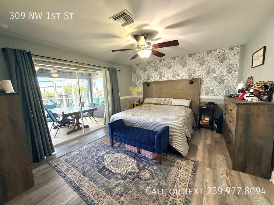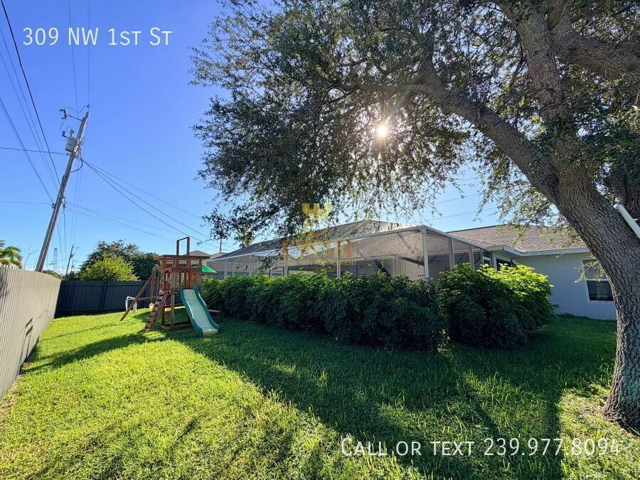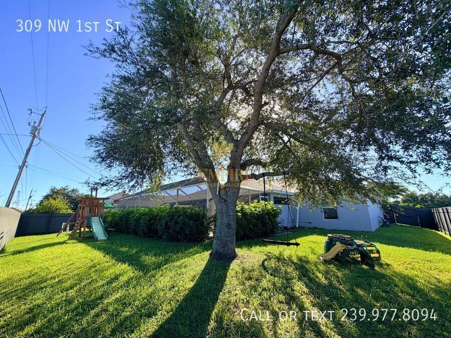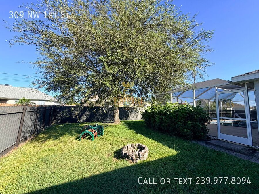 This gorgeous 4 bedroom, 2 bathroom home is located in a great area of Cape Coral and offers everything you need for comfortable Florida living! Enjoy a large screened-in lanai with a stunning custom hardwood ceiling, sparkling pool with safety fence, and a fully fenced backyard featuring a fire pit, playset, and outdoor kitchen—perfect for entertaining! Inside, you’ll find laminate flooring throughout, high ceilings, and plenty of natural light. Also includes a washer and dryer and is on city water. A lovely home in a fantastic location! ** Available Dec 1st ** UTILITIES/SERVICES INCLUDED: Pool, Lawn, Trash AMENITIES INCLUDED: Pool w/ Safety Fence, Screened Lanai, Fully Fenced Yard, Outdoor Kitchen, Outdoor Playset, Fire Pit, Laminate Flooring, High Ceilings, Custom Hardwood Lanai Ceiling, Air Conditioning APPLIANCES INCLUDED: Washer & Dryer, Refrigerator, Microwave, Dishwasher, Range PARKING: 2 Car Garage/Driveway (no parking in the grass) PET RESTRICTIONS: Cats & Dogs allowed with approval through PetScreening GENERAL REQUIREMENTS: + Applicants must be move in ready within 2 weeks of property becoming available + Application fee is $75 per adult + Average credit score of applicants must be a minimum of 600 + Combined monthly income must be at least 2.5x the rent amount + Subject to Credit, Criminal and Eviction searches + Security Deposit may range from 1x-2.5x the monthly rent, based on good credit and rental history, at owner’s discretion + In addition to the rent, we require renters insurance that we can provide for $15 per month + All applications submitted must also include a submission to PetScreening + All information provided is considered reliable, however not guaranteed and is subject to change Empire Property Management Cape Coral Custom Hardwood Lanai Ceiling Fire Pit Fully Fenced Yard Laminate Flooring Lawn Care Outdoor Kitchen Outdoor Playset Pool Service Pool W/ Safety Fence Screened Lanai Trash