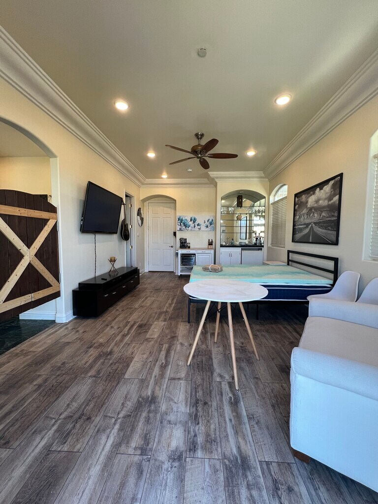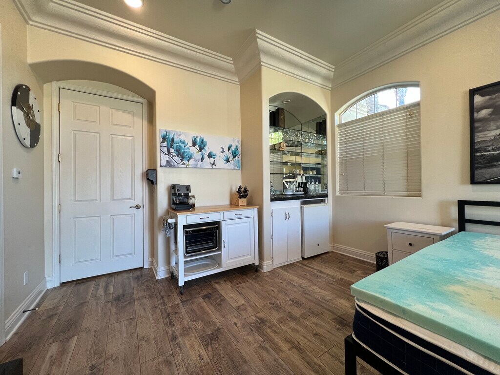 Experience comfort, privacy, wildlife and nature in this beautifully renovated master suite located in a quiet, safe, and peaceful hilltop estate. On the outskirts of Canyon Country, just minutes from the 14 Freeway and approximately 20 minutes to downtown Valencia, this location offers easy access to surrounding areas while being tucked away in the hills of SCV. This large, fully furnished smoke-free suite features soaring 10-foot ceilings, new laminate flooring, and its own private entrance through the expansive front acre of the property. Inside, you'll find a brand-new queen-sized bed and memory foam topper, a 60" HDTV in the main room, and a spacious walk-in closet with ample room for clothing and storage. The en-suite bathroom is a true retreat, featuring marble floors and counters, a deep jacuzzi tub with a 40" flatscreen TV above it, and a multi-head luxury shower with a rainfall feature. The suite includes a kitchenette equipped with a Starbucks barista espresso machine, a large mini-fridge with freezer compartment, and a multifunction Ninja toaster oven/air fryer. The house uses a well to pull water straight from the earth and is not only a pleasure to shower/bathe in but its also incredible drinking water as it is naturally alkaline, tests next to zero for hard metals and contaminants and contains a good amount of salts and minerals. Still, a Waterdrop dispenser filter system will be provided, along with new pillows, new sheets, new towels, dish-ware and silverware, as well as a vacuum, Swiffer sweepers and a Roomba. Step outside to your large front patio, which includes ambient lighting, a peaceful fountain, and access to a Traeger smoker—ideal for enjoying warm evenings or quiet mornings. While tenants do not have access to the main house or backyard, the front of the property and patio area are fully accessible for your use as well as the surrounding areas of quiet dirt roads and endless hiking trails. Pets may be approved on a case-by-case basis. This suite is perfect for a quiet, respectful tenant seeking a peaceful, upscale living space in a beautiful and well-connected location. NOTE: $250 of the $1250 security deposit will be non-refundable as a cleaning fee. Utilities include power, propane, and internet.