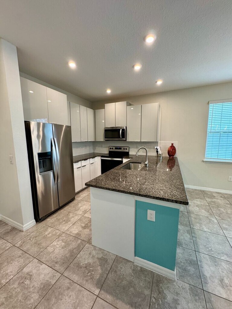 FOR RENT - Beautiful end unit townhouse conveniently located in the sought after community of Waterbrooke in Clermont, just minutes from the turnpike! This 3 bedroom, 2.5 bath home features ceramic tile on the entire first floor. The kitchen features breakfast bar, granite countertops and stainless steel appliances. The open concept layout is spacious, perfect for entertaining and It has a half bath on the first floor . Access to the 2 car garage is from the kitchen for added convenience. Once upstairs you will find a balcony which is screened and 3 bedrooms with 2 full baths. All rooms are spread out and spacious allowing for plenty of room with large closets. Waterbrooke is a gated community that has large resort style pool, splash pad, gym, club house, kids playgrounds and many walking trails!