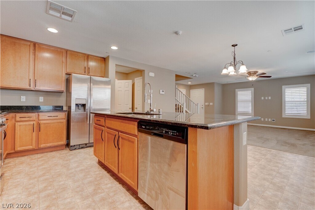 Welcome to Inspirada! This beautifully maintained Energy Star end-unit townhome offers added privacy and scenic views. Inside, enjoy a bright, open layout featuring stainless steel appliances, granite countertops, ceiling fans, and a spacious walk-in closet. The finished garage and abundant storage add convenience and functionality. Located just steps from Inspirada’s exceptional community amenities, residents can enjoy multiple swimming pools, basketball courts, picnic areas, soccer fields, playgrounds, a skate park, and even a splash pad—perfect for an active lifestyle. Situated near Pinecrest Academy, one of Henderson’s newest charter schools, this home combines comfort, efficiency, and an unbeatable location. Please note: ice maker and microwave are provided in as-is condition without repair or replacement service.