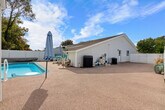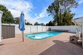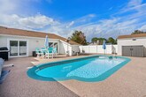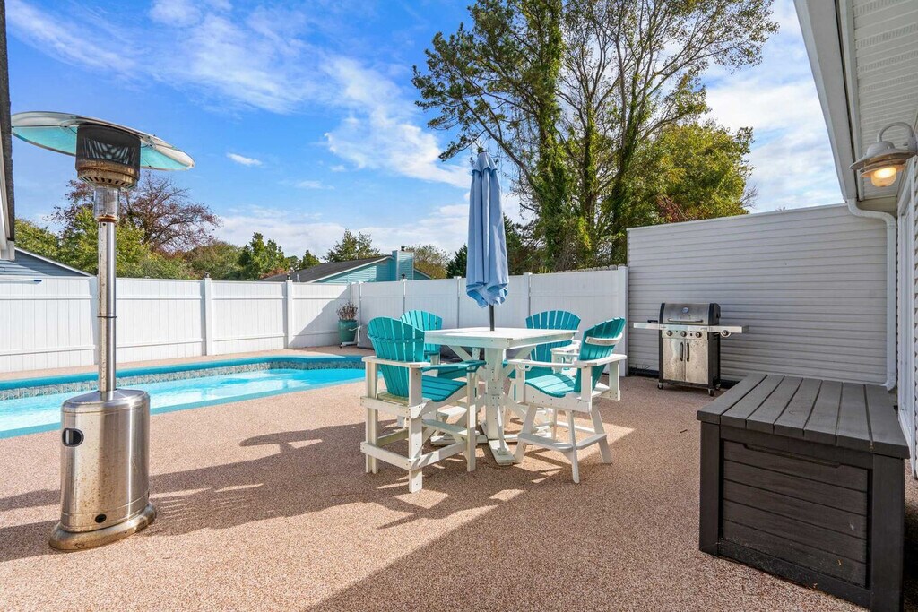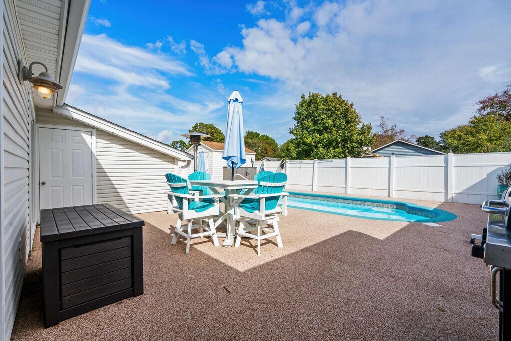 Welcome to this beautiful two-bedroom home located in the heart of Surfside Beach, SC. This spacious open floor plan offers a comfortable and inviting living space with luxury finishes throughout. Enjoy the private swimming pool with optional heating, a gas grill, and an optional luxe golf cart. It's perfect for relaxing and unwinding after a long day at the beach. Just a golf cart ride from the beach, you can easily access the nearby Surfside Pier or take a leisurely stroll along the shore. Entering through the main door, you will find a spacious living room with gorgeous theater-style leather reclining couches and a 75" HD smart TV for all your entertainment needs. The living room opens to the large fully equipped kitchen with new stylish black stainless appliances. Step out the side door and you are immediately poolside! The two bedrooms each have a large closet, a queen bed, pool views, and deck access through sliding glass doors. There is a Jack and Jill style bathroom with double vanities and a toilet off the master bedroom and a separate vanity and toilet accessible from the hallway between bedrooms. There is also a huge shower with a rainfall shower head and gorgeous floor-to-ceiling tile. The brand new fully loaded 4-seat luxury golf cart with Bluetooth stereo is available for rent. Check it out in the listing pictures and just add on at check-out! We recommend renting our awesome super light and durable backpack-style beach chairs to make your stay even more enjoyable, available through a link after your booking. Located off Glenn's Bay Road, with a 30 mph speed limit making it golf cart legal, Indian Oak Lane is a quiet residential street just about 1.5 miles from the Surfside Pier. You will be within a golf cart's ride of the Piggly Wiggly grocery store, downtown Surfside with its fantastic restaurants like Surfside Pizza, Wooden Spoon Cafe, Malibu of Surfside, and many more! Continue onto Surfside Drive straight to the fabulous new Surfside Pier with its several delicious eateries close by as well. You won't have to wander far and you can park the car for the majority of your stay and golf cart the family almost everywhere! This property is non-smoking and pets are not permitted. By state law, occupancy may not exceed five, including infants and children. Check-in is from 4:00-10:00 PM and check-out is at 10:00 AM. Quiet hours are between 11 PM-7 AM as per Surfside Beach ordinance. Please consider your neighbors and keep noise to a reasonable level. Please ensure you are attending the gas grill at all times during usage. All garbage should be firmly secured in bags and placed in the trash can inside the enclosed pool patio area. No fireworks or flammable materials or any other articles deemed hazardous are permitted. Please limit parking to the driveway only. [SI]